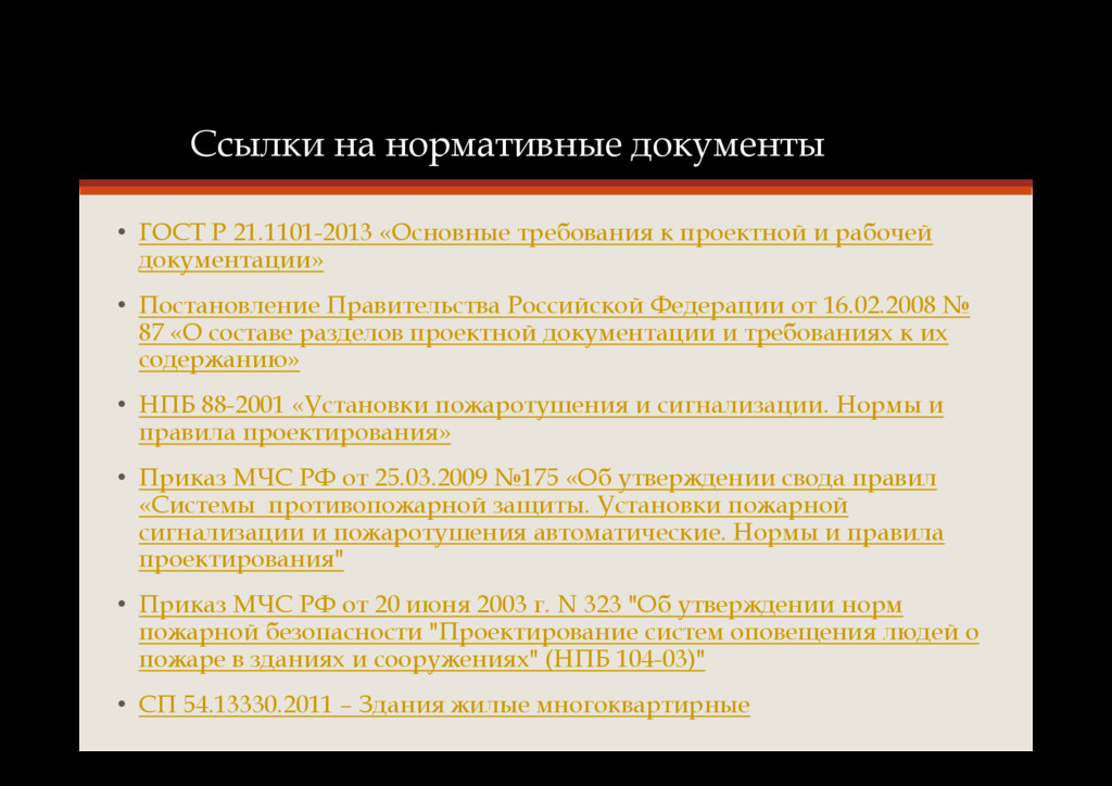 к проектной и рабочей документации» • Постановление Правительства Российской Федерации от 16.02.2008 № 87 «О составе разделов проектной документации и требованиях к их содержанию» • НПБ 88-2001 «Установки пожаротушения и сигнализации. Нормы и правила проектирования» • Приказ МЧС РФ от 25.03.2009 №175 «Об утверждении свода правил «Системы противопожарной защиты. Установки пожарной сигнализации и пожаротушения автоматические. Нормы и правила проектирования" • Приказ МЧС РФ от 20 июня 2003 г. N 323 "Об утверждении норм пожарной безопасности "Проектирование систем оповещения людей о пожаре в зданиях и сооружениях" (НПБ 104-03)" • СП 54.13330.2011 – Здания жилые многоквартирные