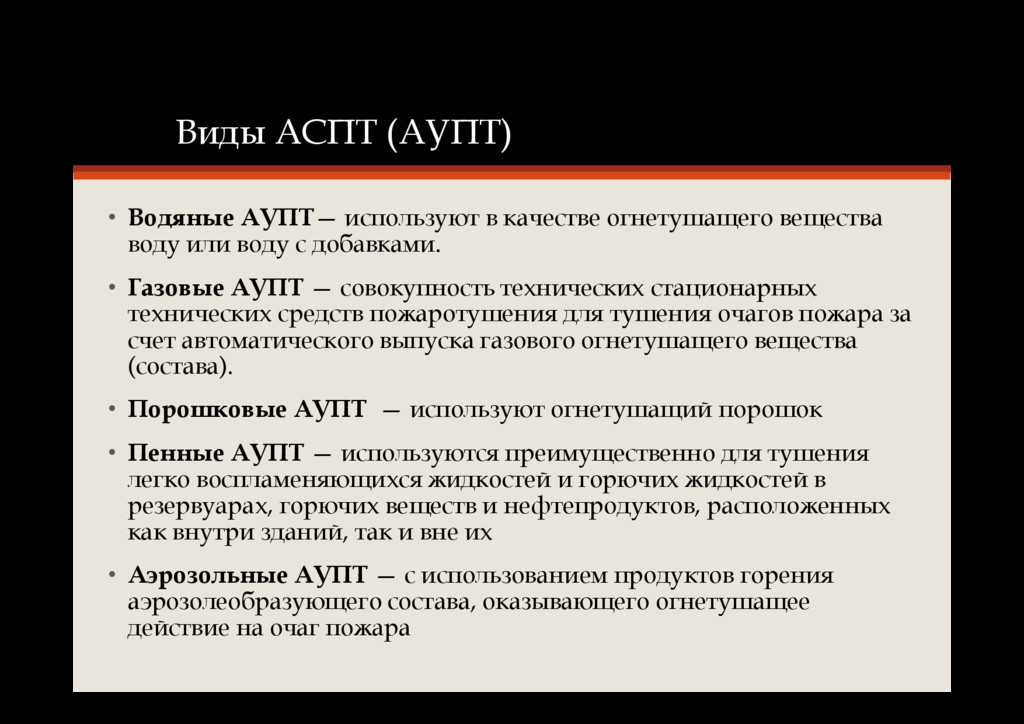 документации в котором описываются технические характеристики системы в текстовом и графическом формате • Одна из составляющих автоматической противопожарной защиты (АППЗ) • Установка пожаротушения, автоматически срабатывающая при превышении контролируемым фактором (факторами) пожара пороговых значений в защищаемой зоне • Принятое сокращенное наименование подраздела в проектной документации – АСПТ (АУПТ)