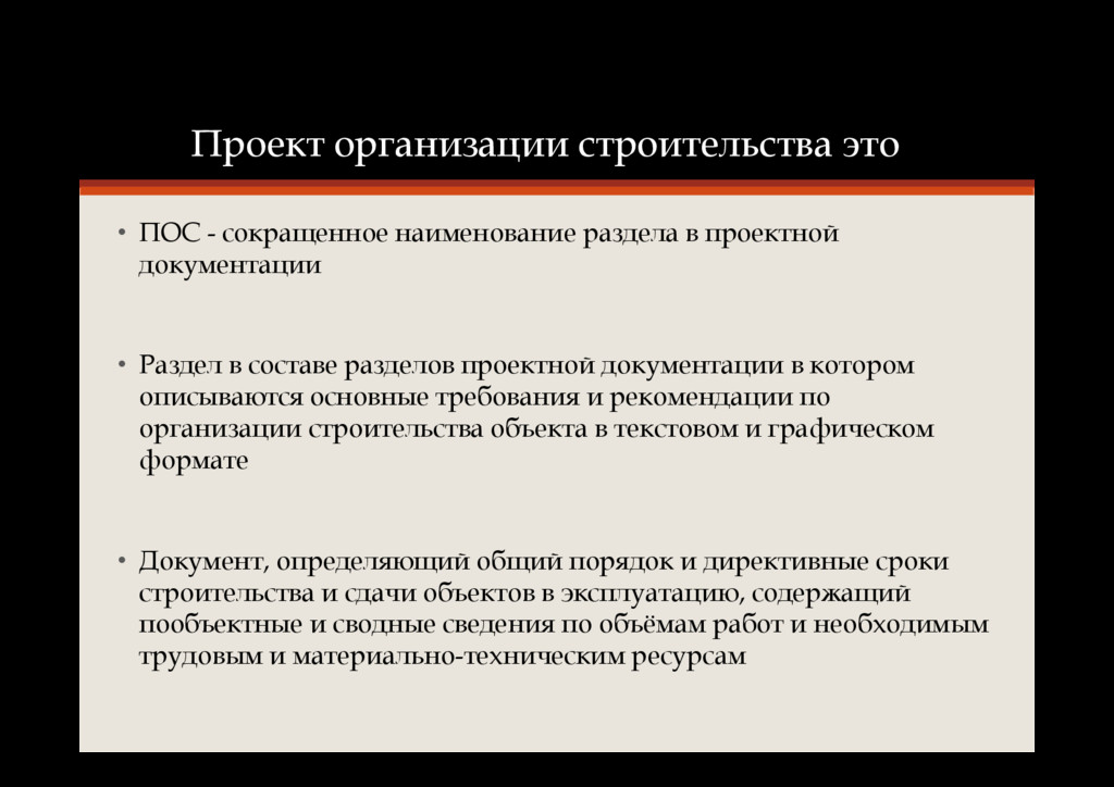в проектной документации • Раздел в составе разделов проектной документации в котором описываются основные требования и рекомендации по организации строительства объекта в текстовом и графическом формате • Документ, определяющий общий порядок и директивные сроки строительства и сдачи объектов в эксплуатацию, содержащий пообъектные и сводные сведения по объёмам работ и необходимым трудовым и материально-техническим ресурсам