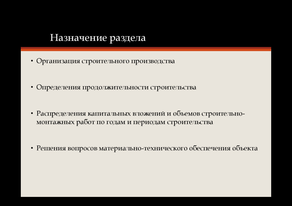 • Распределения капитальных вложений и объемов строительно- монтажных работ по годам и периодам строительства • Решения вопросов материально-технического обеспечения объекта