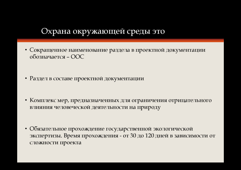 документации обозначается – ООС • Раздел в составе проектной документации • Комплекс мер, предназначенных для ограничения отрицательного влияния человеческой деятельности на природу • Обязательное прохождение государственной экологической экспертизы. Время прохождения - от 30 до 120 дней в зависимости от сложности проекта