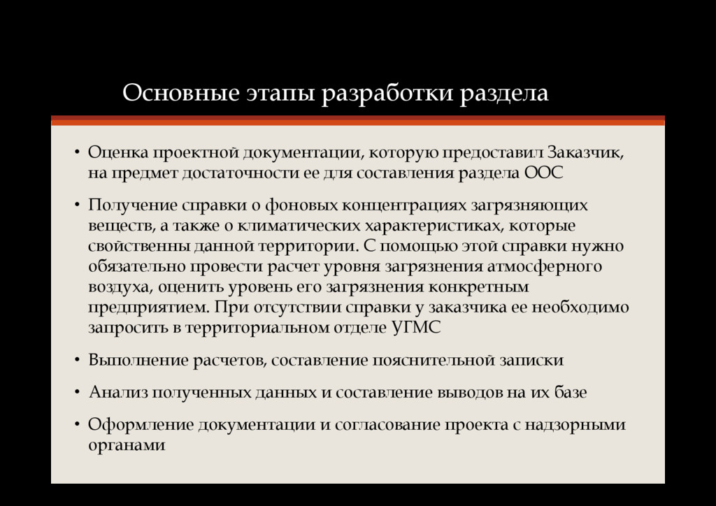 Заказчик, на предмет достаточности ее для составления раздела ООС • Получение справки о фоновых концентрациях загрязняющих веществ, а также о климатических характеристиках, которые свойственны данной территории. С помощью этой справки нужно обязательно провести расчет уровня загрязнения атмосферного воздуха, оценить уровень его загрязнения конкретным предприятием. При отсутствии справки у заказчика ее необходимо запросить в территориальном отделе УГМС • Выполнение расчетов, составление пояснительной записки • Анализ полученных данных и составление выводов на их базе • Оформление документации и согласование проекта с надзорными органами