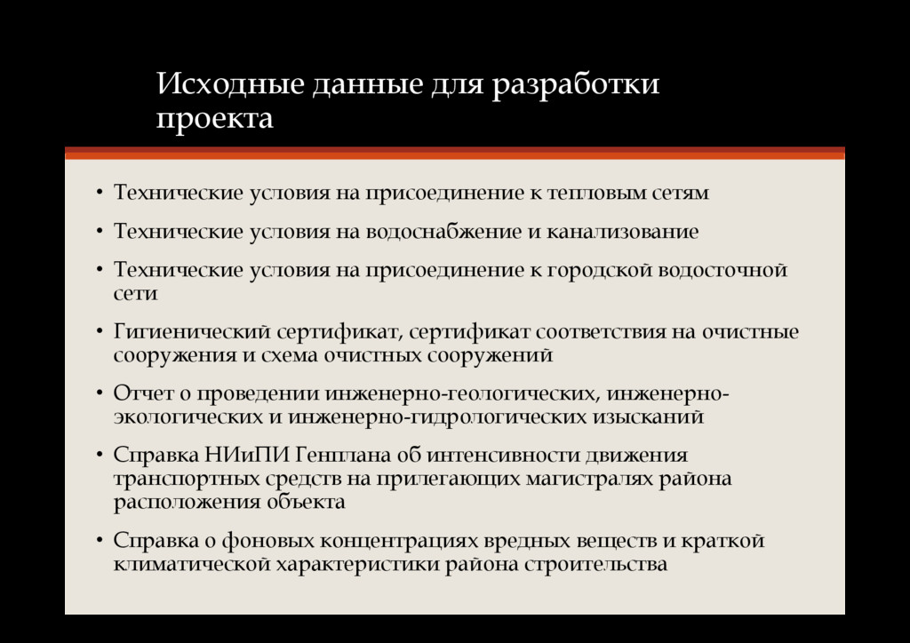 к тепловым сетям • Технические условия на водоснабжение и канализование • Технические условия на присоединение к городской водосточной сети • Гигиенический сертификат, сертификат соответствия на очистные сооружения и схема очистных сооружений • Отчет о проведении инженерно-геологических, инженерно- экологических и инженерно-гидрологических изысканий • Справка НИиПИ Генплана об интенсивности движения транспортных средств на прилегающих магистралях района расположения объекта • Справка о фоновых концентрациях вредных веществ и краткой климатической характеристики района строительства