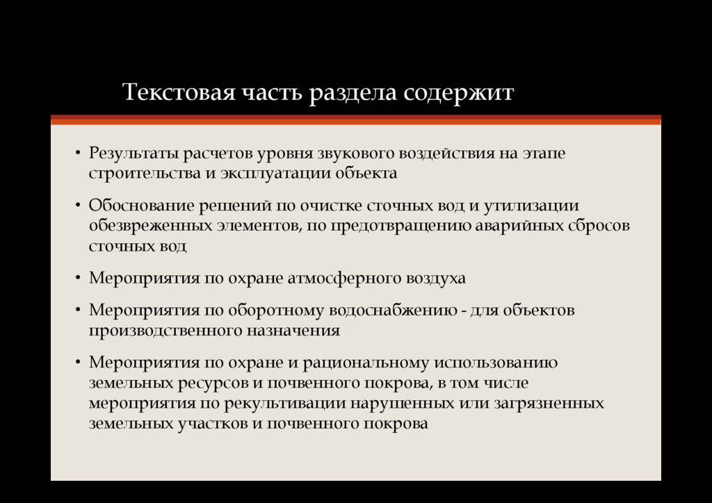 на этапе строительства и эксплуатации объекта • Обоснование решений по очистке сточных вод и утилизации обезвреженных элементов, по предотвращению аварийных сбросов сточных вод • Мероприятия по охране атмосферного воздуха • Мероприятия по оборотному водоснабжению - для объектов производственного назначения • Мероприятия по охране и рациональному использованию земельных ресурсов и почвенного покрова, в том числе мероприятия по рекультивации нарушенных или загрязненных земельных участков и почвенного покрова