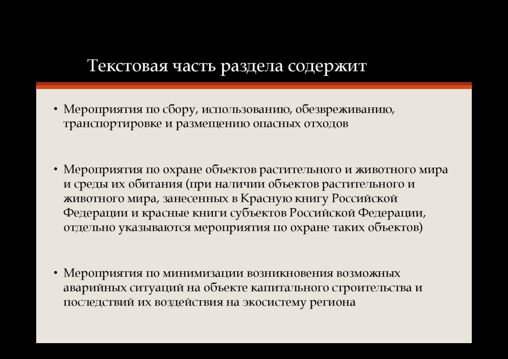 транспортировке и размещению опасных отходов • Мероприятия по охране объектов растительного и животного мира и среды их обитания (при наличии объектов растительного и животного мира, занесенных в Красную книгу Российской Федерации и красные книги субъектов Российской Федерации, отдельно указываются мероприятия по охране таких объектов) • Мероприятия по минимизации возникновения возможных аварийных ситуаций на объекте капитального строительства и последствий их воздействия на экосистему региона