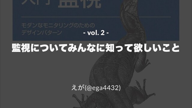 今回取り扱う書籍 対象読者 監視の基本を理解したい人 実践的かつ実用的な例、アドバイスを知りたい人 前回の話 導入編: https://speakerdeck.com/ega4432/introductory- monitoring 監視についてみんなに知って欲しいこと 2021