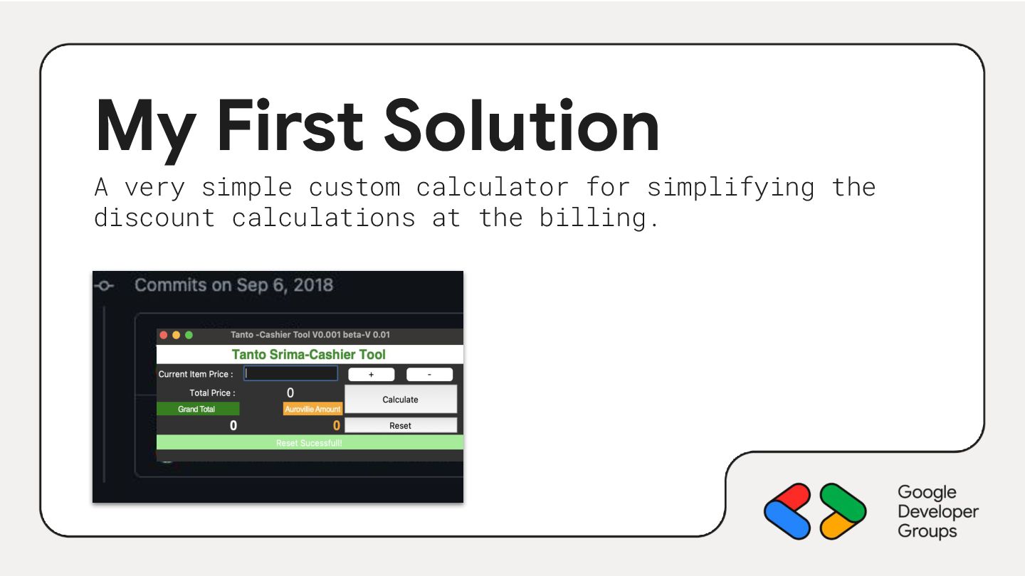 The presentation shares a personal journey of rebuilding from zero, starting with a simple Python calculator built to solve a billing problem at an Auroville guest house. That first solution led to acceptance into Zoho Schools and eventually a career as an Android Developer at Zoho.