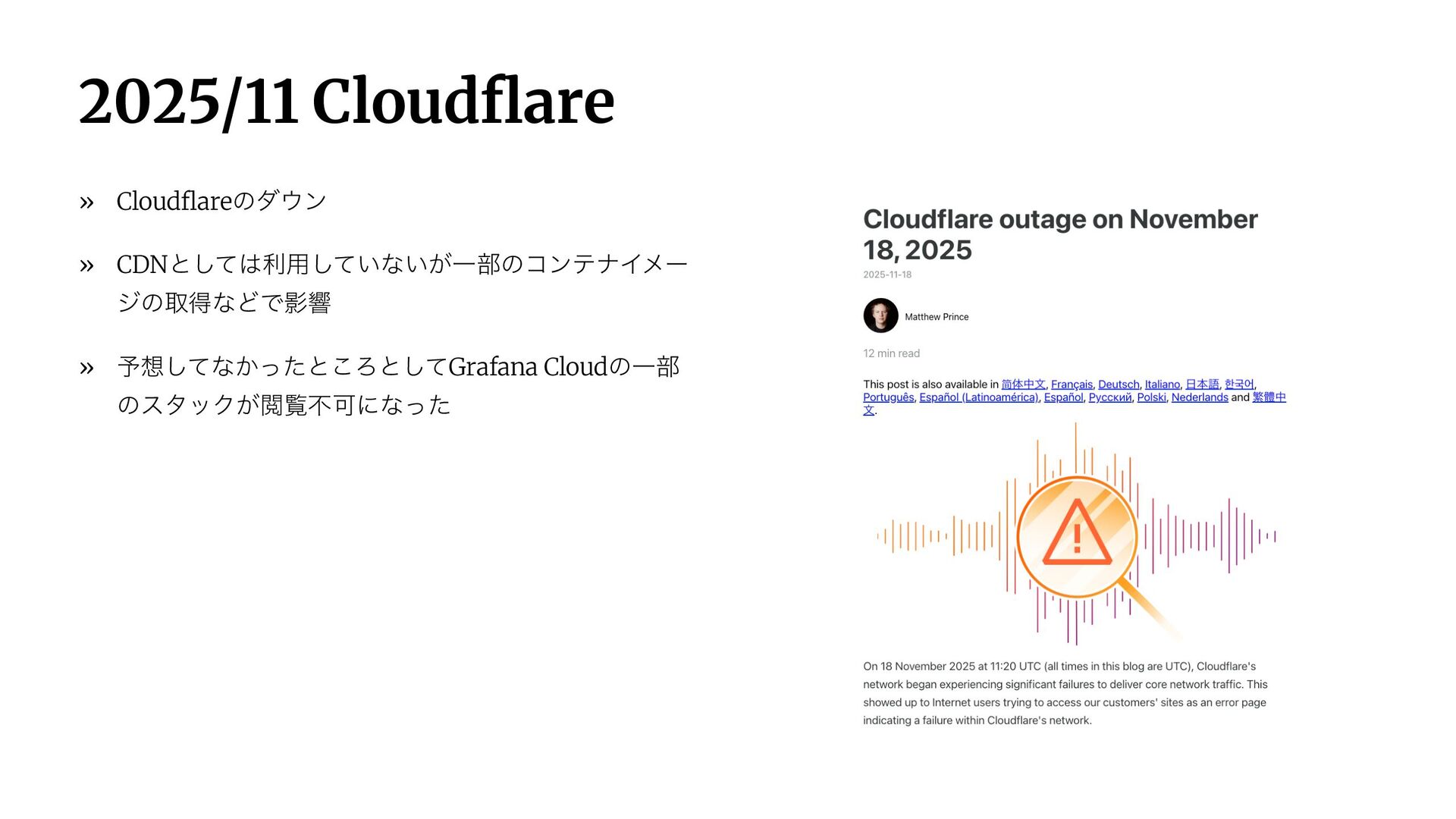» 2025/11 Cloudflare » ͦͷଞͷώϯτʹ͍ͭͯ͢ » ϩέʔγϣϯΛόϥ͢ઓུ » ೝূج൫ͷαʔϏε͕ར༻ෆՄʹͳͬͨΒʁ » ϝʔϧαʔόΛΦϯϓϨ͔ΒΫϥυҠߦͨ࣌͠ͷձ » ·ͱΊ