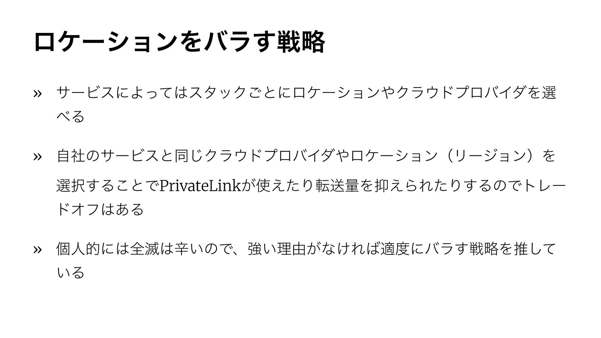ϩέʔγϣϯΛόϥ͢ઓུ » αʔϏεʹΑͬͯελοΫ͝ͱʹϩέʔγϣϯΫϥυϓϩόΠμΛબ Δ » ࣗࣾͷαʔϏεͱಉ͡ΫϥυϓϩόΠμϩέʔγϣϯʢϦʔδϣϯʣΛ બ͢Δ͜ͱͰPrivateLink͕͑ͨΓసૹྔΛ͑ΒΕͨΓ͢ΔͷͰτϨʔ υΦϑ͋Δ » ݸਓతʹશ໓ਏ͍ͷͰɺڧ͍ཧ༝͕ͳ͚Εదʹόϥ͢ઓུΛਪͯ͠