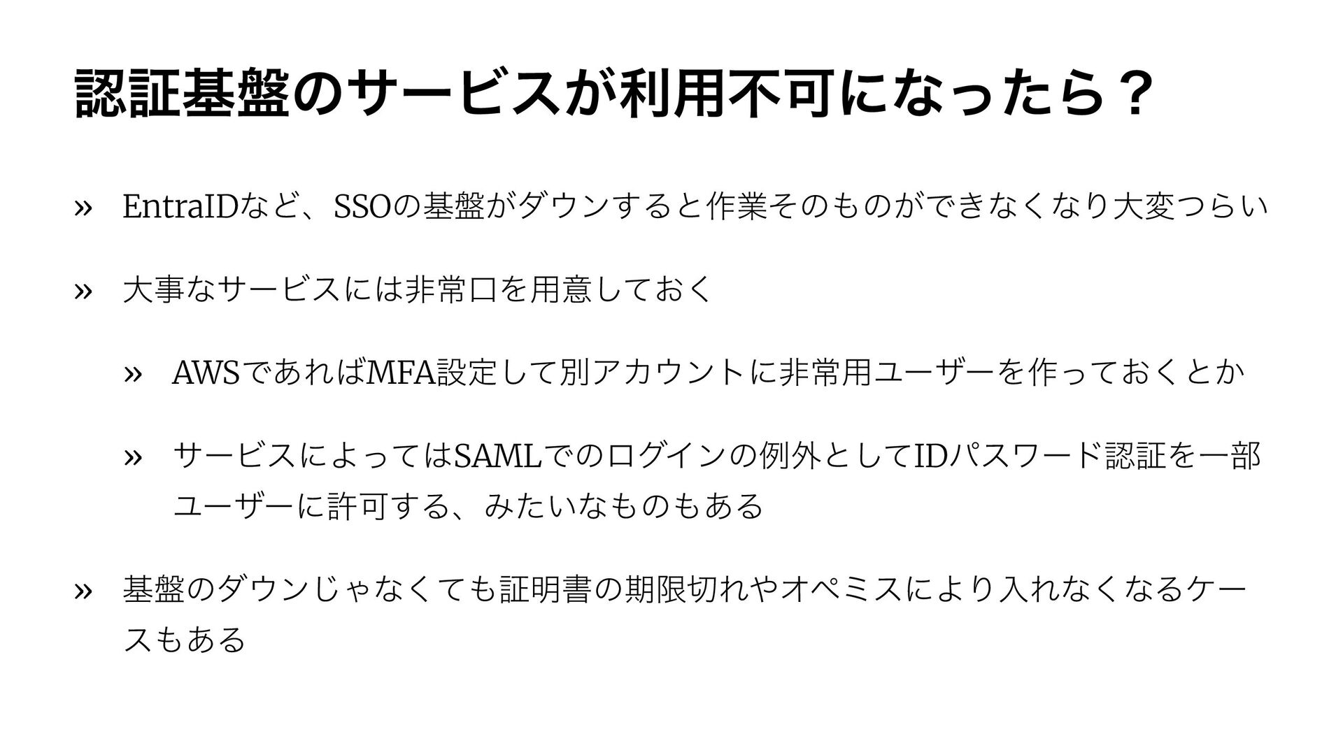 ೝূج൫ͷαʔϏε͕ར༻ෆՄʹͳͬͨΒʁ » EntraIDͳͲɺSSOͷج൫͕μϯ͢Δͱ࡞ۀͦͷͷ͕Ͱ͖ͳ͘ͳΓେมͭΒ͍ » େࣄͳαʔϏεʹඇৗޱΛ༻ҙ͓ͯ͘͠ » AWSͰ͋ΕMFAઃఆͯ͠ผΞΧϯτʹඇৗ༻ϢʔβʔΛ࡞͓ͬͯ͘ͱ͔ » αʔϏεʹΑͬͯSAMLͰͷϩάΠϯͷྫ֎ͱͯ͠IDύεϫʔυೝূΛҰ෦ ϢʔβʔʹڐՄ͢ΔɺΈ͍ͨͳͷ͋Δ
