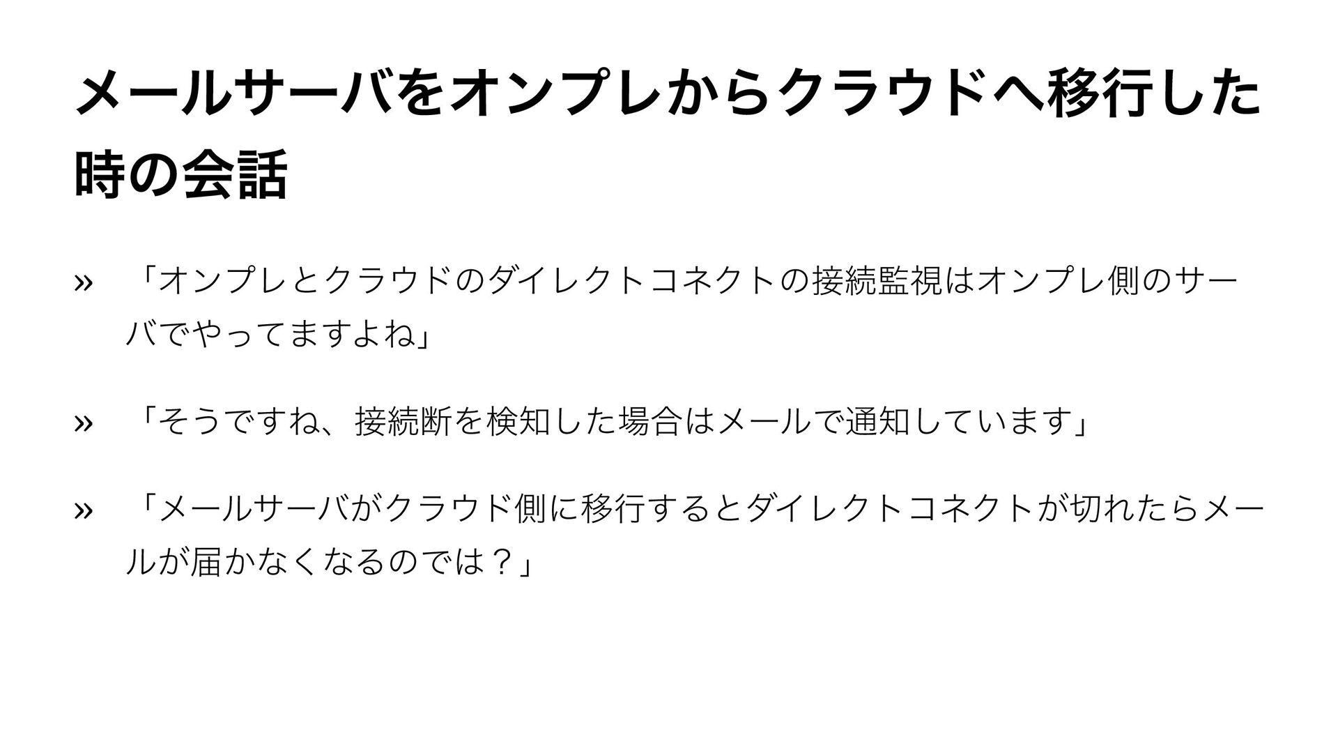 ϝʔϧαʔόΛΦϯϓϨ͔ΒΫϥυҠߦͨ͠ ࣌ͷձ » ʮΦϯϓϨͱΫϥυͷμΠϨΫτίωΫτͷଓࢹΦϯϓϨଆͷαʔ όͰͬͯ·͢ΑͶʯ » ʮͦ͏Ͱ͢ͶɺଓஅΛݕͨ͠߹ϝʔϧͰ௨͍ͯ͠·͢ʯ » ʮϝʔϧαʔό͕ΫϥυଆʹҠߦ͢ΔͱμΠϨΫτίωΫτ͕ΕͨΒϝʔ ϧ͕ಧ͔ͳ͘ͳΔͷͰʁʯ