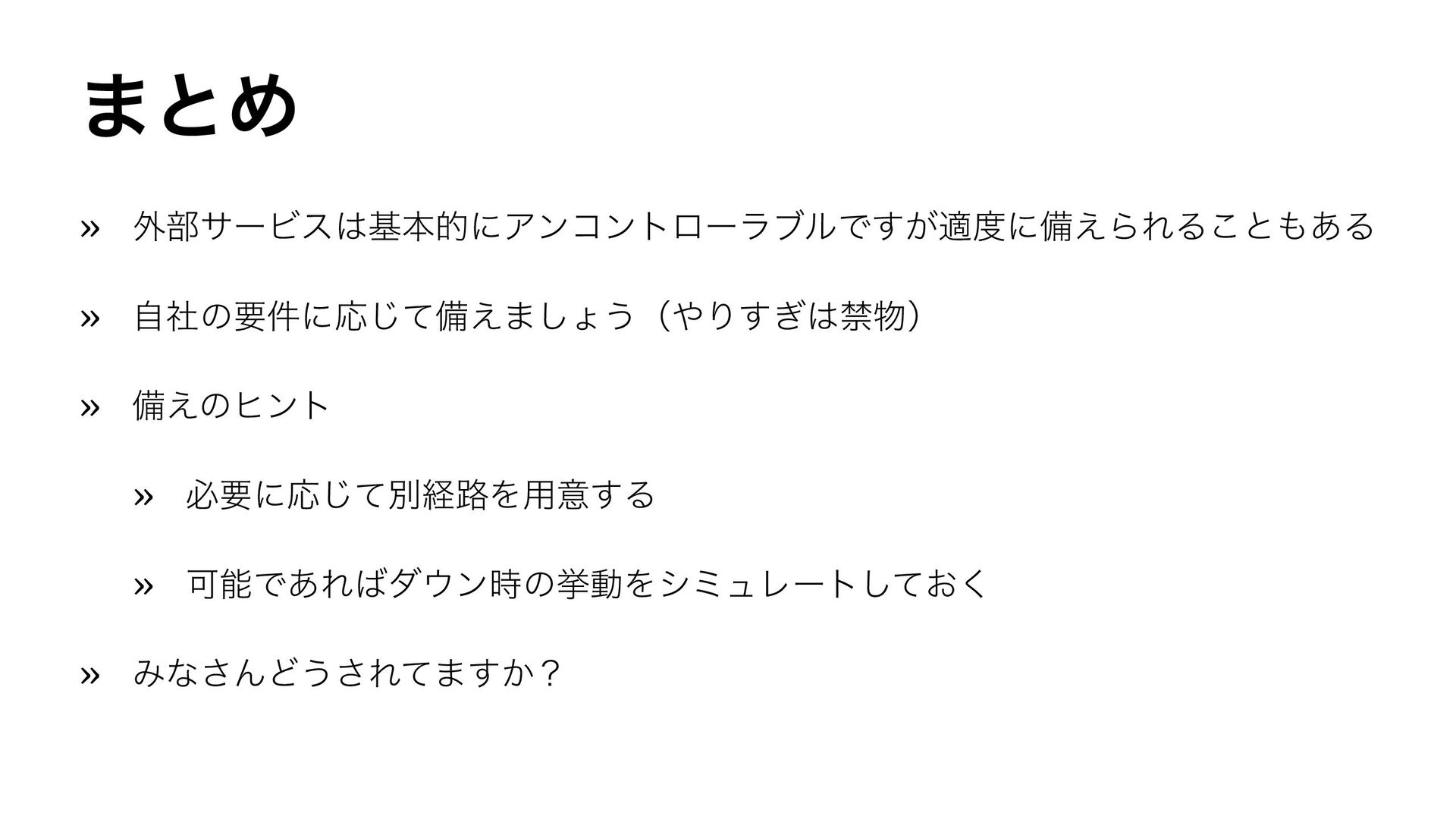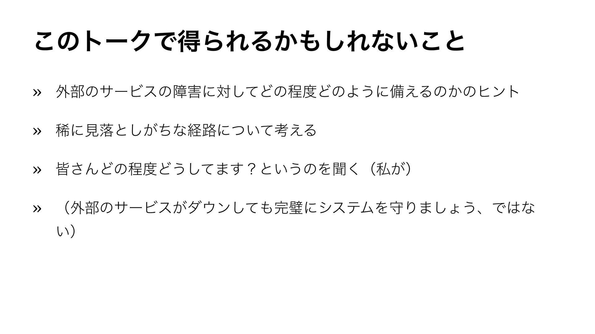 ͜ͷτʔΫͰಘΒΕΔ͔͠Εͳ͍͜ͱ » ֎෦ͷαʔϏεͷোʹରͯ͠ͲͷఔͲͷΑ͏ʹඋ͑Δͷ͔ͷώϯτ » كʹݟམͱ͕ͪ͠ͳܦ࿏ʹ͍ͭͯߟ͑Δ » օ͞ΜͲͷఔͲ͏ͯ͠·͢ʁͱ͍͏ͷΛฉ͘ʢࢲ͕ʣ » ʢ֎෦ͷαʔϏε͕μϯͯ͠ᘳʹγεςϜΛकΓ·͠ΐ͏ɺͰͳ ͍ʣ