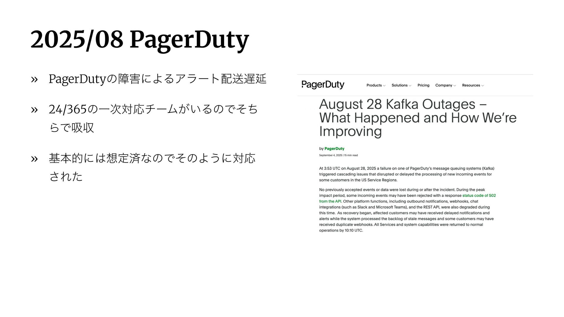 2025/08 PagerDuty » PagerDutyͷোʹΑΔΞϥʔτૹԆ » 24/365ͷҰ࣍ରԠνʔϜ͕͍ΔͷͰͦͪ ΒͰٵऩ » جຊతʹఆࡁͳͷͰͦͷΑ͏ʹରԠ ͞Εͨ
