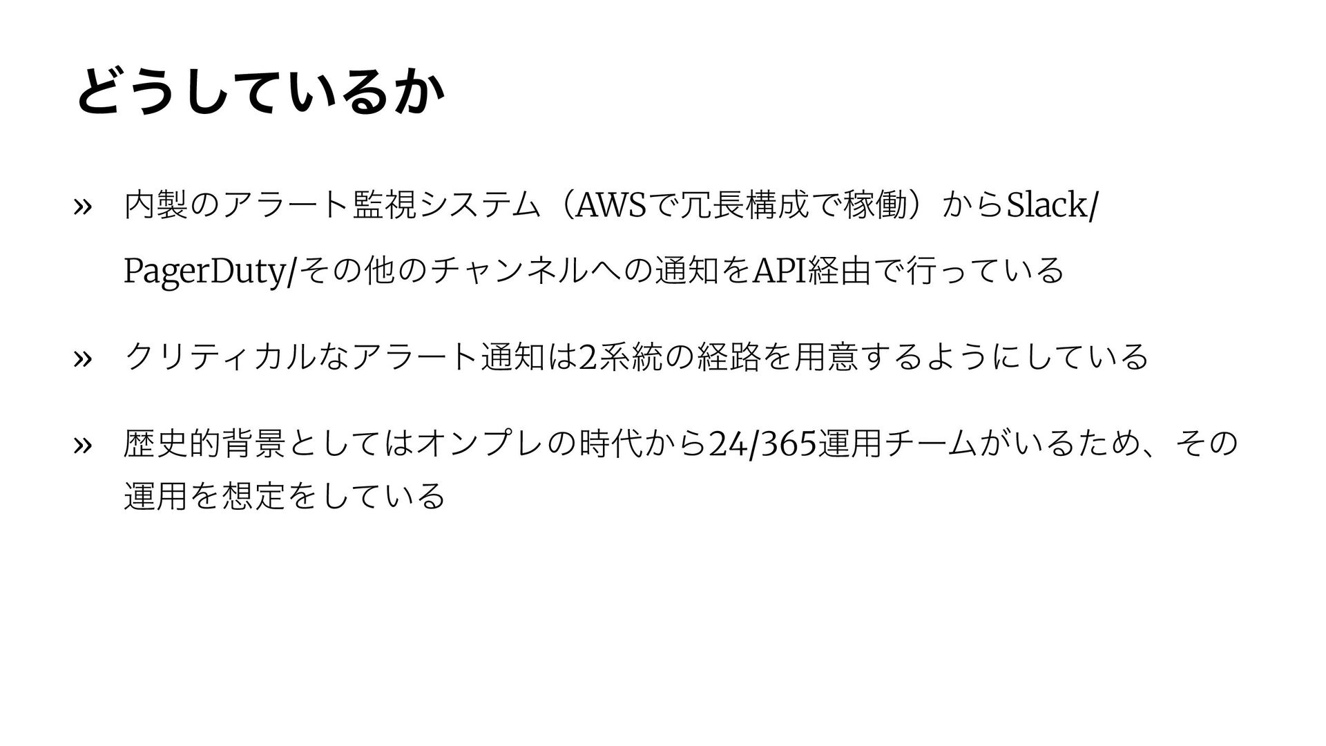 Ͳ͏͍ͯ͠Δ͔ » ͷΞϥʔτࢹγεςϜʢAWSͰߏͰՔಇʣ͔ΒSlack/ PagerDuty/ͦͷଞͷνϟϯωϧͷ௨ΛAPIܦ༝Ͱߦ͍ͬͯΔ » ΫϦςΟΧϧͳΞϥʔτ௨2ܥ౷ͷܦ࿏Λ༻ҙ͢ΔΑ͏ʹ͍ͯ͠Δ » ྺ࢙తഎܠͱͯ͠ΦϯϓϨͷ͔࣌Β24/365ӡ༻νʔϜ͕͍ΔͨΊɺͦͷ ӡ༻ΛఆΛ͍ͯ͠Δ
