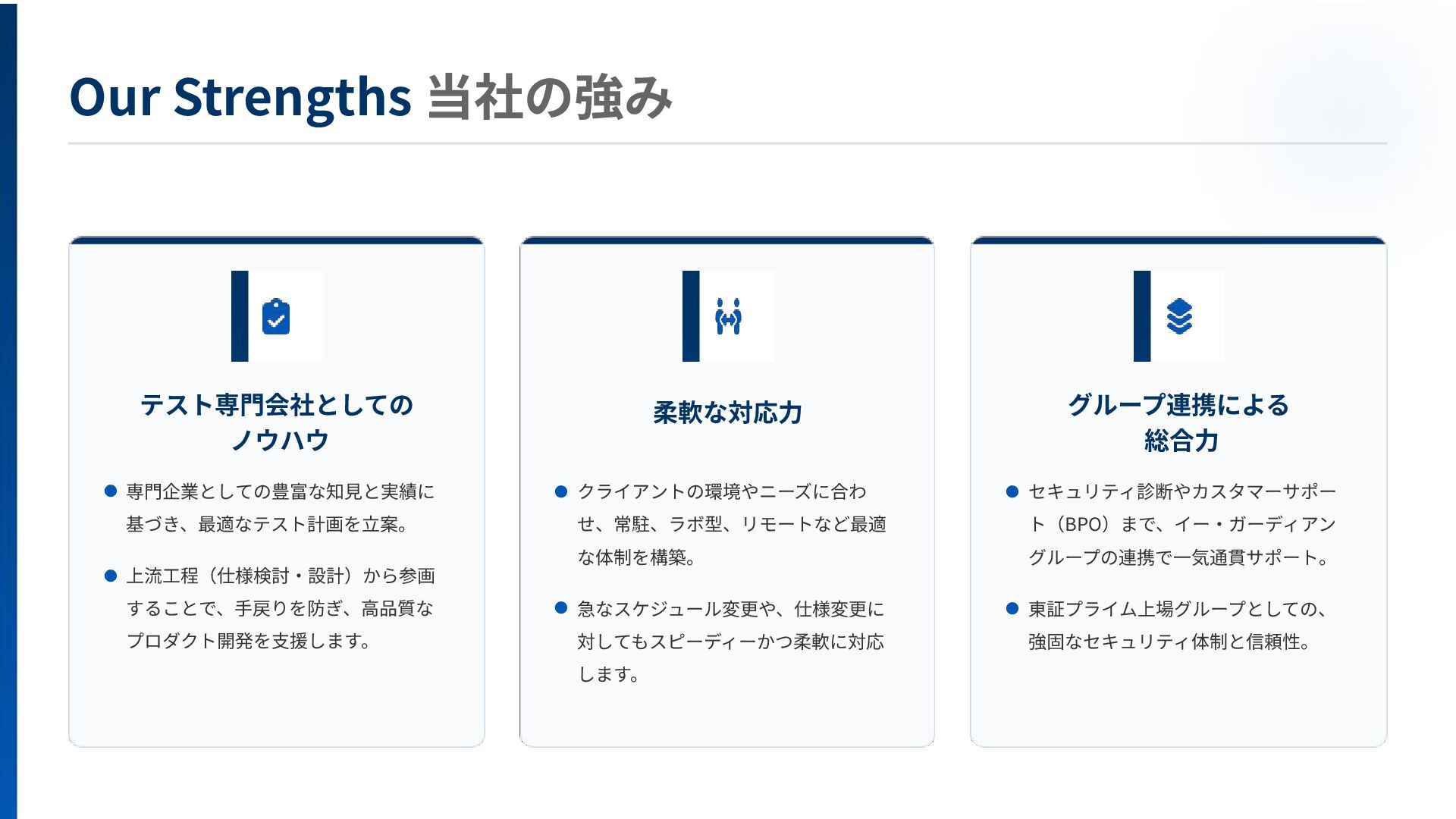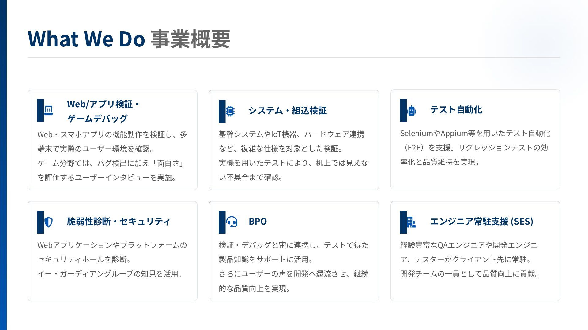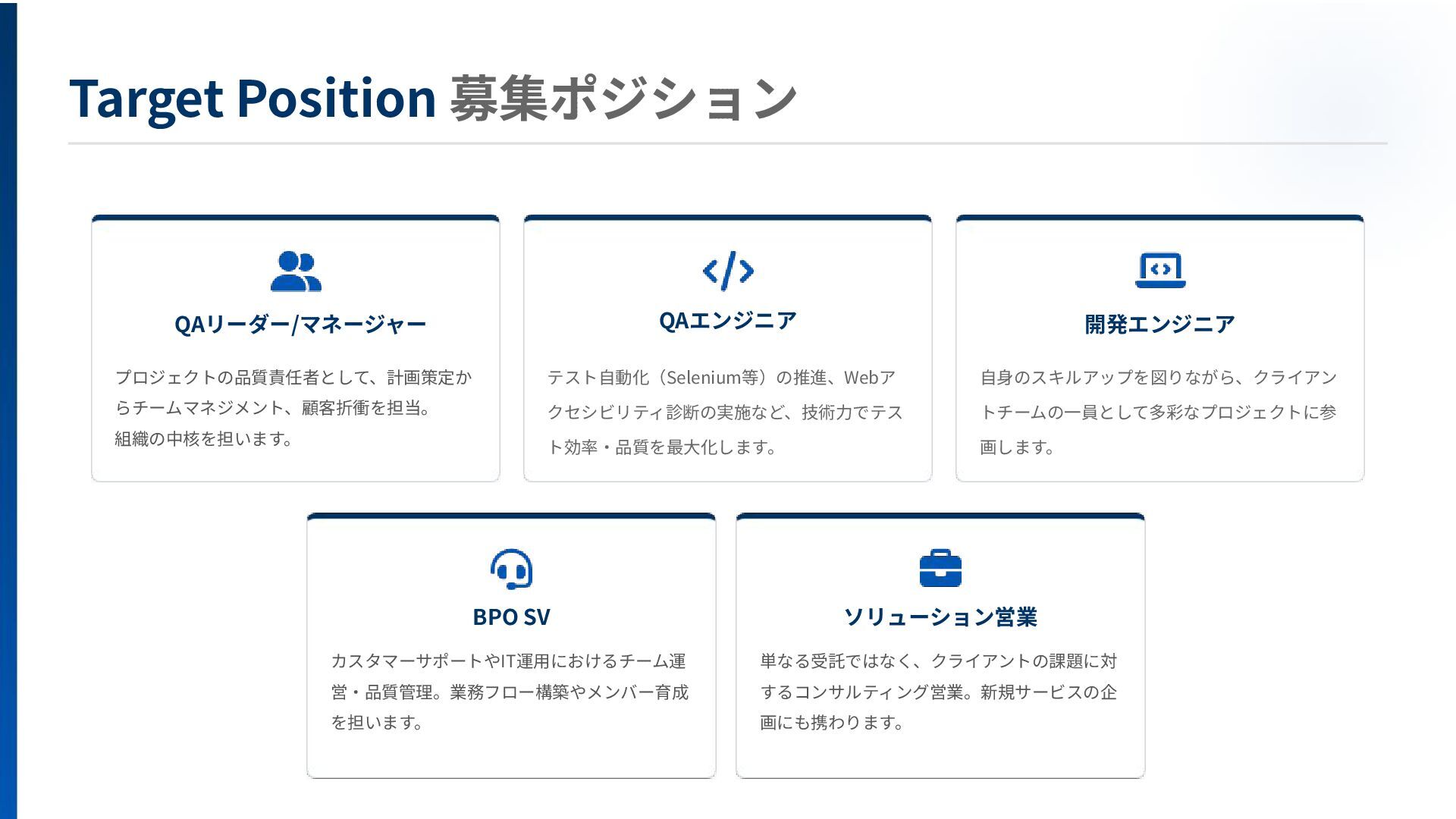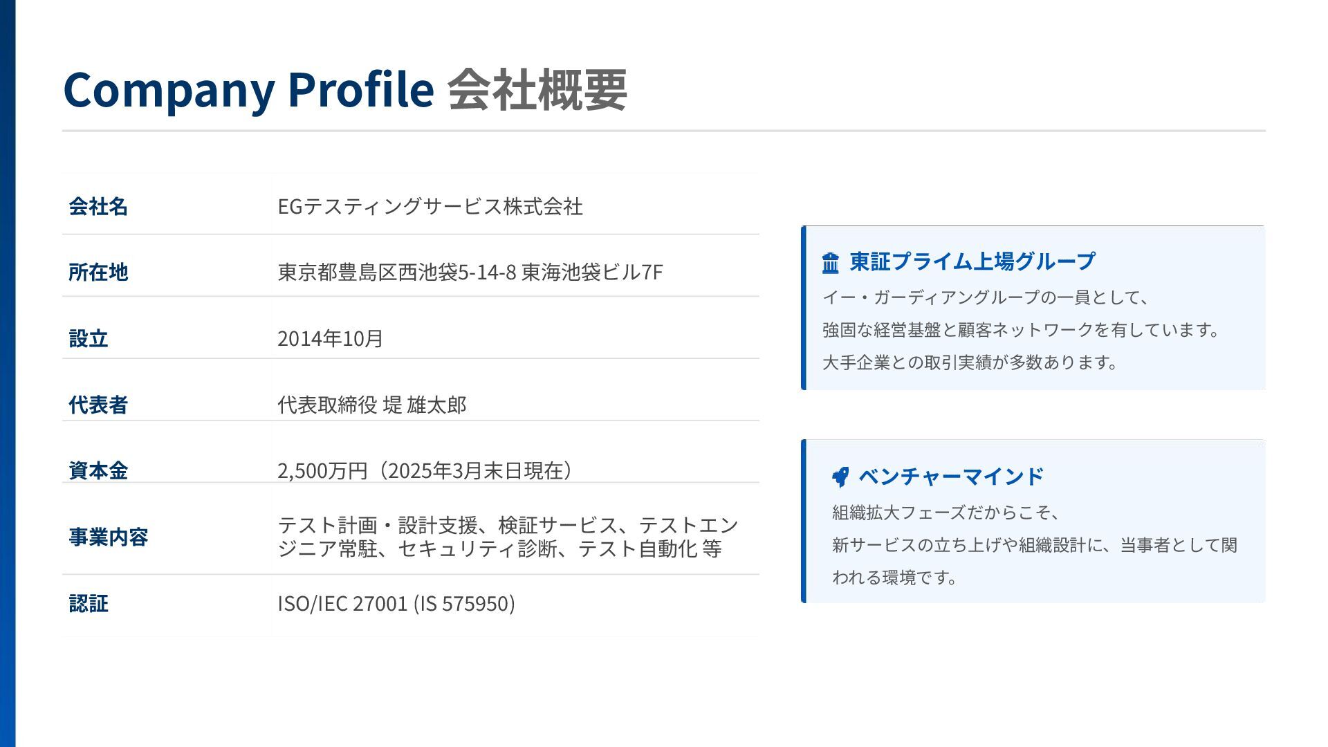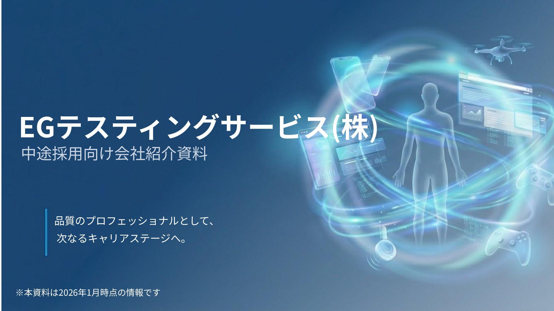 本資料では、EGテスティングサービス(株)の事業内容や募集ポジションついてご紹介しています。
