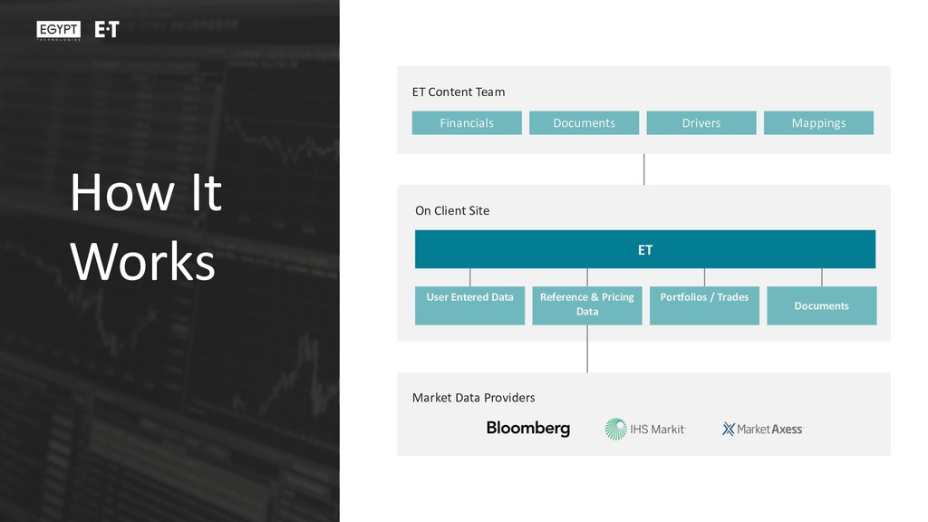 On Client Site User Entered Data Reference & Pricing Data Portfolios / Trades Documents ET How It Works