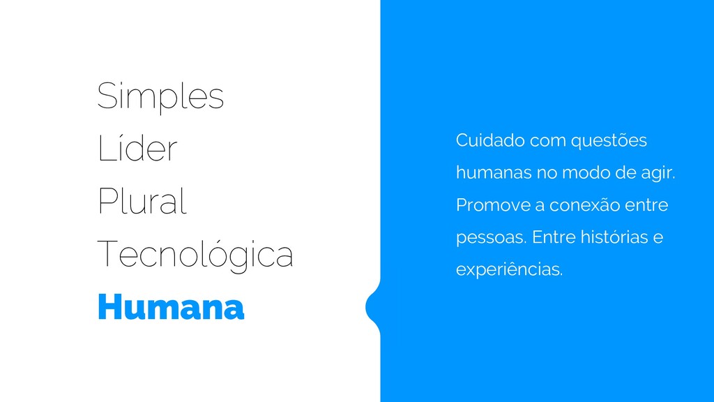 Simples Líder Plural Tecnológica Humana Simplicidade é o core. A