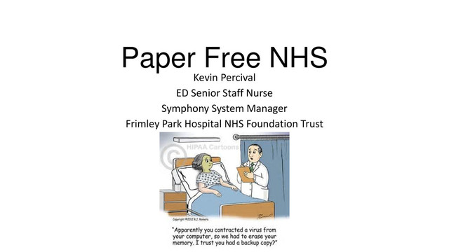 my own trust • There is audit evidence that only about 70% of observations are actually done and/or recorded when done paper based • When electronic systems are introduced recording increases to nearly 100%. • Partly, this is due to the fact that it is obvious where the gaps are and, perhaps more importantly, who is responsible. • Steps in tasks can be made compulsory and there is no ‘corner-cutting’ or skipping items http://www.buildingbetterhealthcare.co.uk/technical/article_page/Comment_How _healthcare_IT_can_help_address_the_findings_of_the_Francis_Report/86940 Accessed 2/6/13