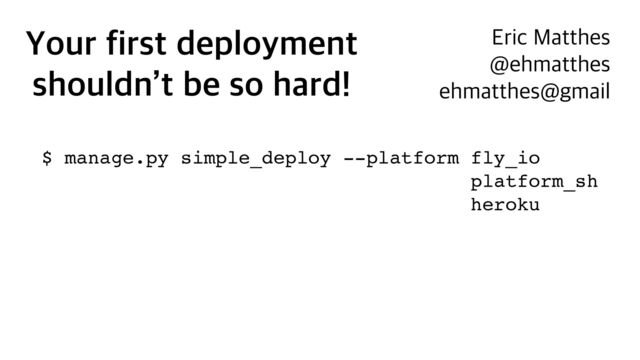 This is an overview of django-simple-deploy, which automatically configures your Django project for deployment to the platform of your choice. It can also automate the entire deployment process.