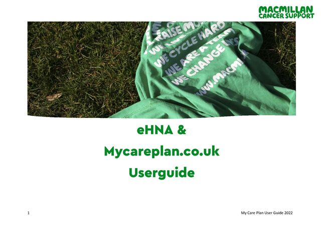 – eHNA and mycareplan.co.uk Macmillan’s Electronic Holistic Needs Assessment (eHNA) is an individual-held assessment questionnaire that allows an individual to identify their most significant concerns at key points along their cancer pathway. The assessment covers a wide range of physical, practical, emotional, family, and spiritual concerns. Assessment responses are sent to the team providing their care via Mycareplan.co.uk allowing for a meaningful conversation, to help resolve concerns raised and record the actions to be taken in a care or support plan. Care and Support plans can be shared with the individual and others providing care. Data reports are available to all users via CSV files and can be used for reporting or analysis. This user guide has been developed to help you use the Macmillan eHNA and the Care & Support planning tools. Overview of key activities: • Depending on your level of access as a care and support plan user you will be able to set up assessments, view assessments and care plans, contribute to care plans, lock/unlock care plans, download care plans and view some of the data that eHNA collects. • The assessment can be completed anywhere by the individual: i.e. while visiting the hospital or organisation site, on their own smartphone, tablet, laptop, or PC. • Assessment results will automatically appear in the care and support planning website to allow the care planning process to begin. • Once the care plans are completed, they can be downloaded as PDF files for sharing with the individual or with other members of the team, AHPs, and so on. • Data from the assessment & care planning is available in a CSV file format for local analysis in Excel or other tools. Note: - The eHNA is made up of two separate websites: o one used by the individual to complete the eHNA assessment, o one used by the professional to set up assessments and complete the care planning.