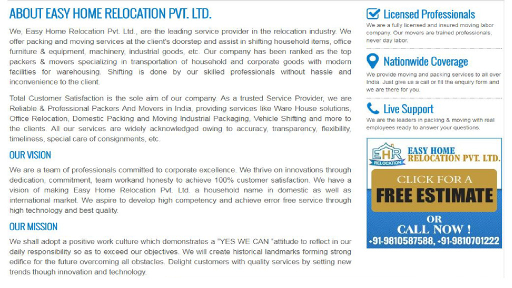 We are a team of professionals committed to corporate excellence. We thrive on innovations through dedication, commitment, teamwork and honesty to achieve 100% customer satisfaction. We have a vision of making Easy Home Relocation Pvt. Ltd. a household name in domestic as well as international market. We aspire to develop high competency and achieve error-free service through high technology and best quality.