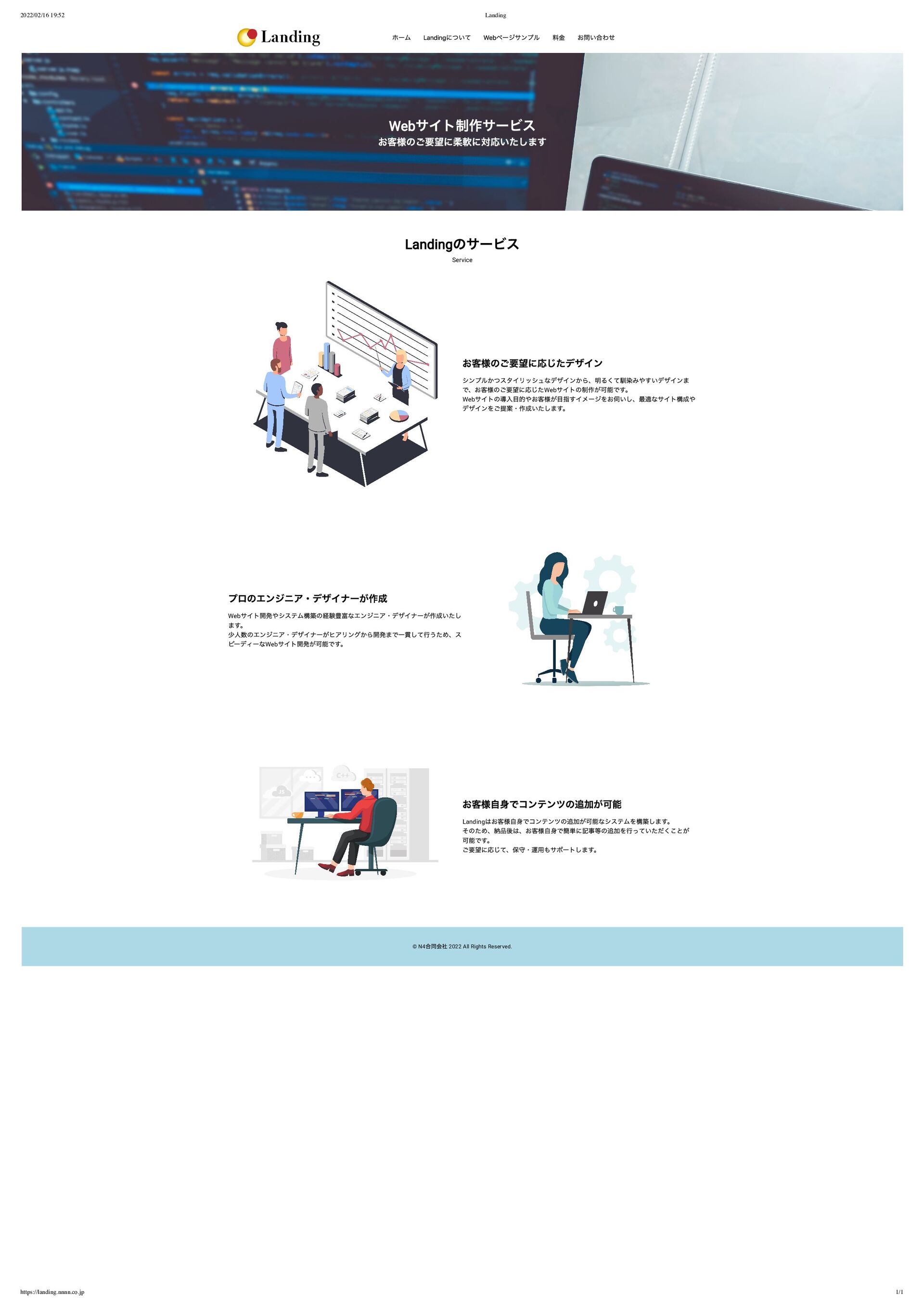お客様のご要望に柔軟に対応いたします Landing のサービス Service お客様のご要望に応じたデザイン シンプルかつスタイリッシュなデザインから、明るくて馴染みやすいデザインま で、お客様のご要望に応じたWeb サイトの制作が可能です。 Web サイトの導入目的やお客様が目指すイメージをお伺いし、最適なサイト構成や デザインをご提案・作成いたします。 プロのエンジニア・デザイナーが作成 Web サイト開発やシステム構築の経験豊富なエンジニア・デザイナーが作成いたし ます。 少人数のエンジニア・デザイナーがヒアリングから開発まで一貫して行うため、ス ピーディーなWeb サイト開発が可能です。 お客様自身でコンテンツの追加が可能 Landing はお客様自身でコンテンツの追加が可能なシステムを構築します。 そのため、納品後は、お客様自身で簡単に記事等の追加を行っていただくことが 可能です。 ご要望に応じて、保守・運用もサポートします。 © N4 合同会社 2022 All Rights Reserved. ホーム Landingについて Webページサンプル 料金 お問い合わせ