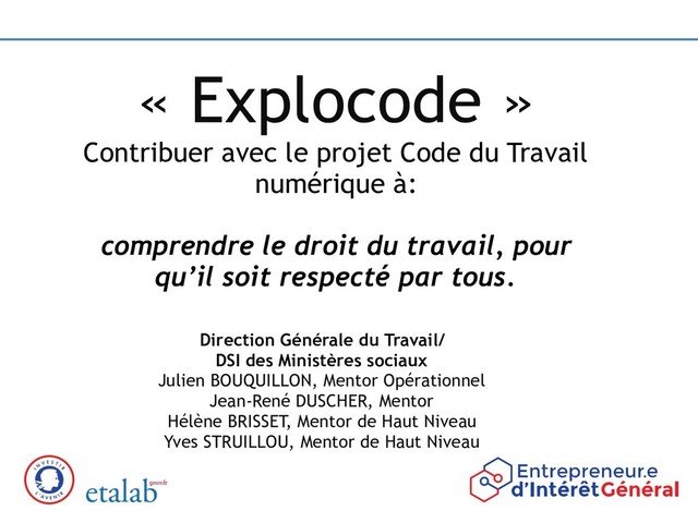 numérique à: comprendre le droit du travail, pour qu’il soit respecté par tous. Direction Générale du Travail/ DSI des Ministères sociaux Julien BOUQUILLON, Mentor Opérationnel Jean-René DUSCHER, Mentor Hélène BRISSET, Mentor de Haut Niveau Yves STRUILLOU, Mentor de Haut Niveau