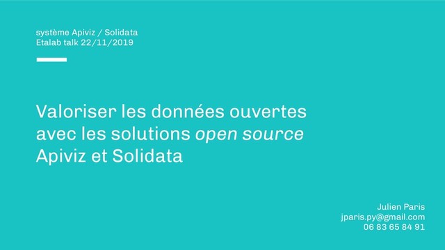 de plusieurs jeux de données (potentiellement géolocalisées) distincts qu'il s'agit de valoriser sous la forme d'un site internet dédié, c'est-à-dire un site permettant à la fois de visualiser l'ensemble de ces données sous forme d'une cartographie mais aussi d'opérer des tris (filtres) ou encore d'afficher des pages de contenus statiques (description du projet, contacts, partenaires...). • A cette fin il est proposé au client d'utiliser la solution open source Apiviz / Solidata sous sa forme mutualisée ou SAAS : Solidata afin de servir les données via des points d'API dédiés, Apiviz afin de visualiser lesdites données sur un site internet complet et dédié à la data-visualisation. • L'implémentation est composée de plusieurs temps distincts : ◦ accompagnement au formatage des données client : accompagnement sur place ou en télé-conférence, définition des champs à afficher sur le site final, nomenclaturage des filtres et colonnes de tags, écriture de supports d'aide à la décision (correspondances entre champs des données et maquette d'Apiviz)... ◦ intégration des jeux de données client à Solidata et configuration de l'instance d'Apiviz spécifique pour le client : implémentation du modèle de données général dans Solidata, import des différents jeux de données client dans Solidata, configuration de l'instance d'ApiViz (data endpoints, contenus statiques, couleurs, vues, footer, filtres, menus, logo, ...) ◦ mise en production : intégration des contenus statiques produits et mis en ligne par le client (par ex. fichiers .html sur un repo Github), mise en ligne du site fonctionnant avec Apiviz sous l'URL fournie par le client"