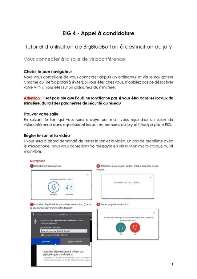 BigBlueButton à destination du jury Vous connecter à la salle de visioconférence Choisir le bon navigateur Nous vous conseillons de vous connecter depuis un ordinateur et via le navigateur Chrome ou Firefox (Safari à éviter). Si vous êtes chez vous, n’oubliez pas de désactiver votre VPN si vous êtes sur un ordinateur du ministère. Attention : il est possible que l’outil ne fonctionne pas si vous êtes dans les locaux du ministère, du fait des paramètres de sécurité du réseau. Trouver votre salle En suivant le lien qui vous sera envoyé par mail, vous rejoindrez un salon de visioconférence dans lequel seront les autres membres du jury et l’équipe pilote EIG. Régler le son et la vidéo Il vous sera d’abord demandé de tester le son et la vidéo. En cas de problème avec le microphone, nous vous conseillons de réessayer en utilisant un micro-casque ou kit main-libre.