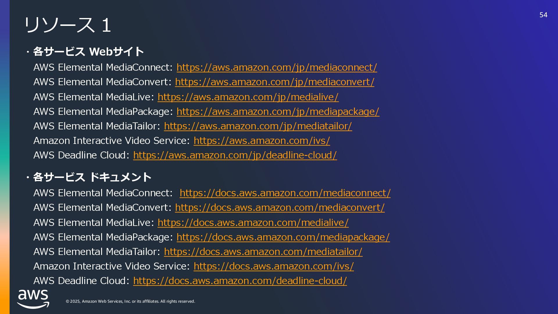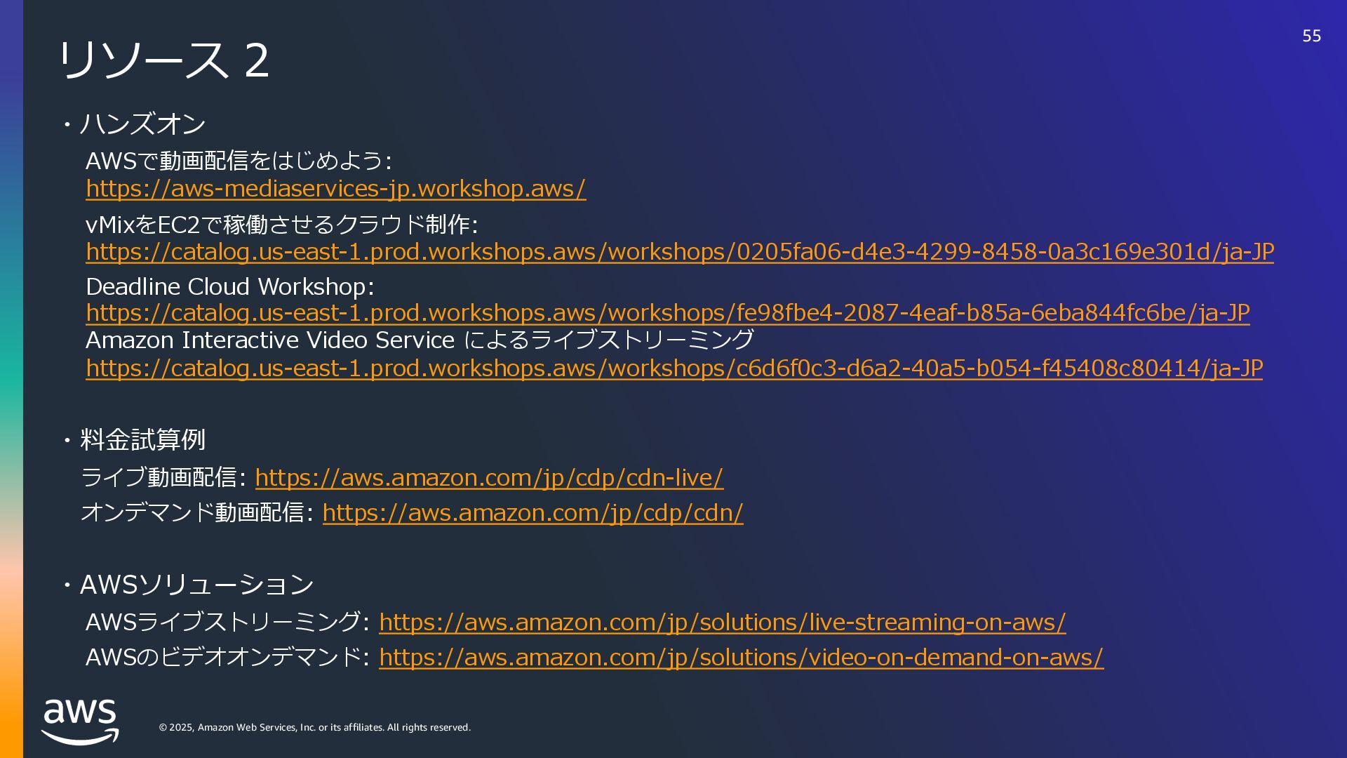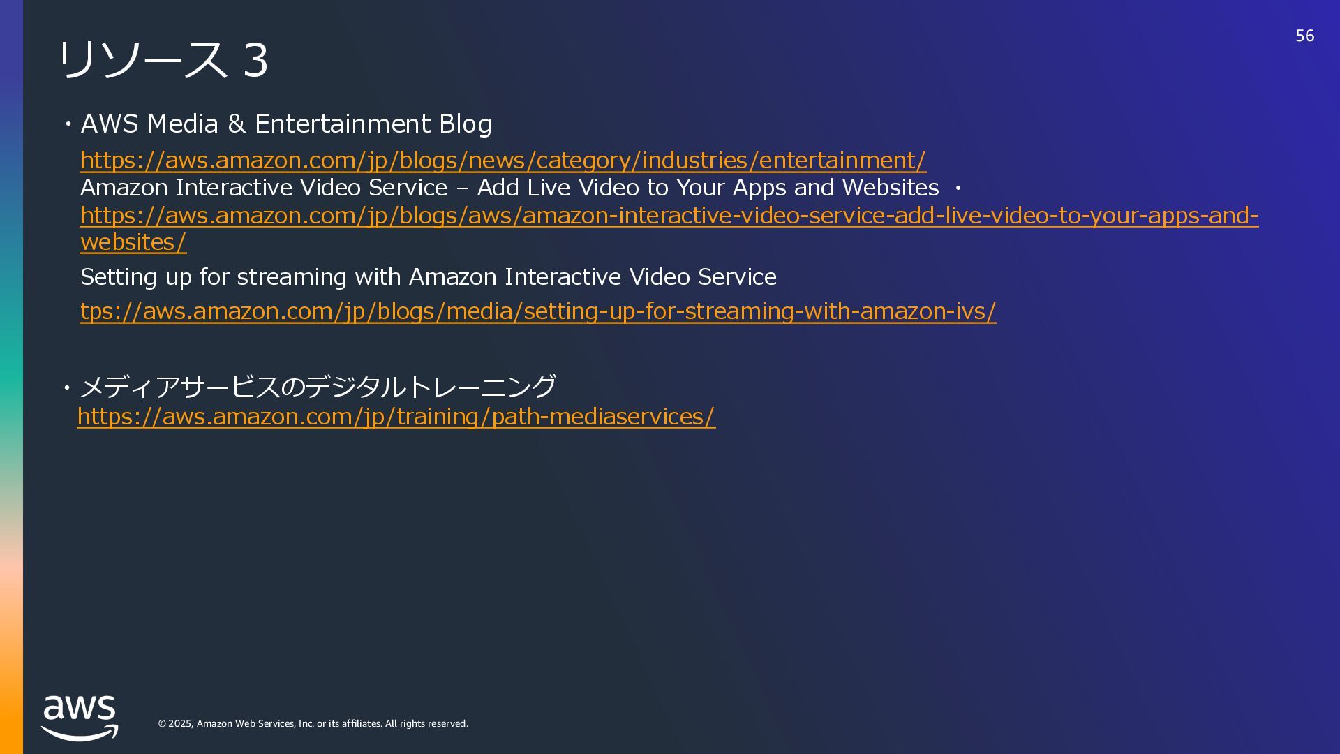 rights reserved. リソース 3 ・AWS Media & Entertainment Blog https://aws.amazon.com/jp/blogs/news/category/industries/entertainment/ Amazon Interactive Video Service – Add Live Video to Your Apps and Websites ・ https://aws.amazon.com/jp/blogs/aws/amazon-interactive-video-service-add-live-video-to-your-apps-and- websites/ Setting up for streaming with Amazon Interactive Video Service tps://aws.amazon.com/jp/blogs/media/setting-up-for-streaming-with-amazon-ivs/ ・メディアサービスのデジタルトレーニング https://aws.amazon.com/jp/training/path-mediaservices/ 56