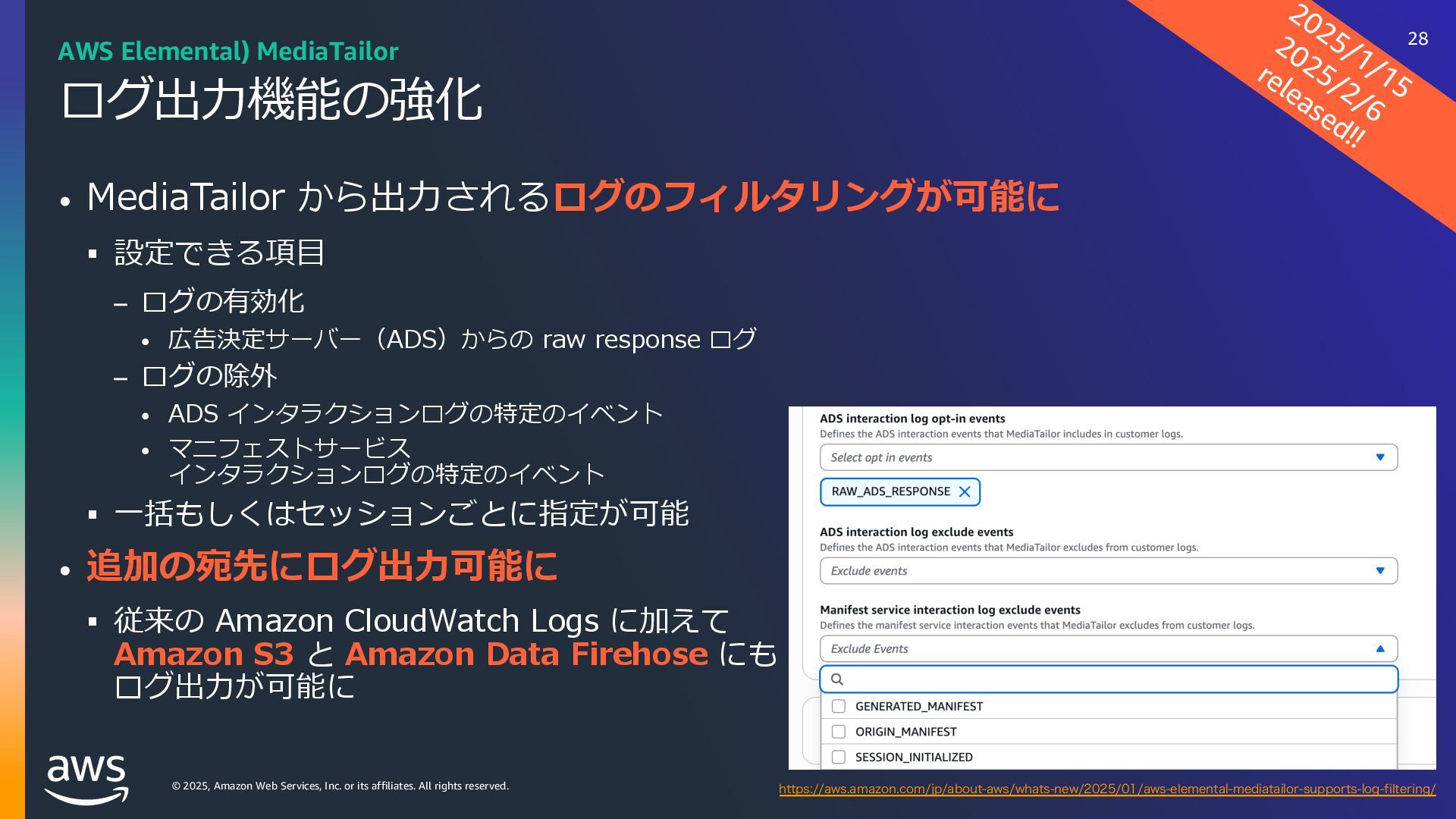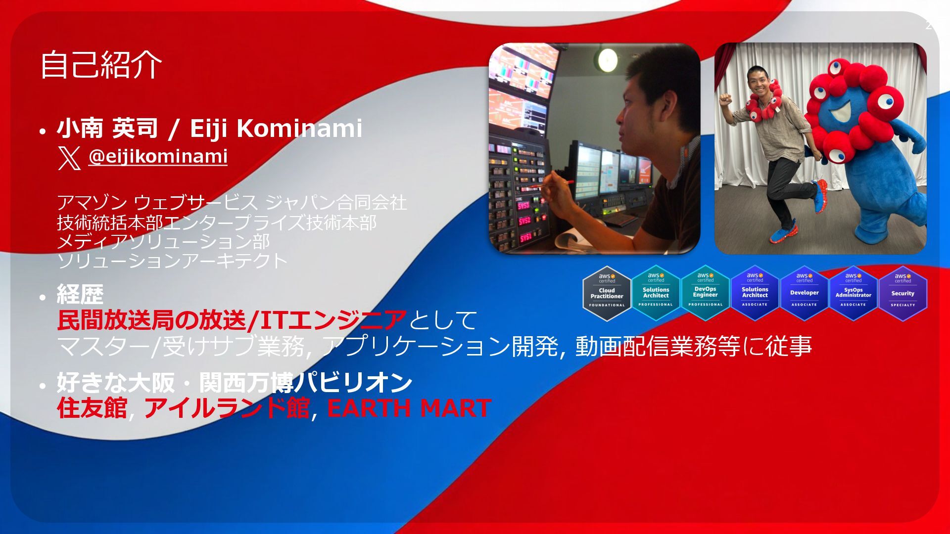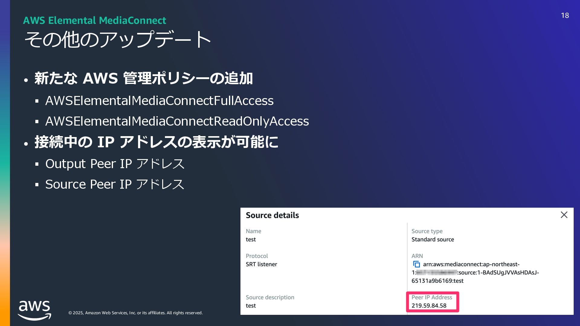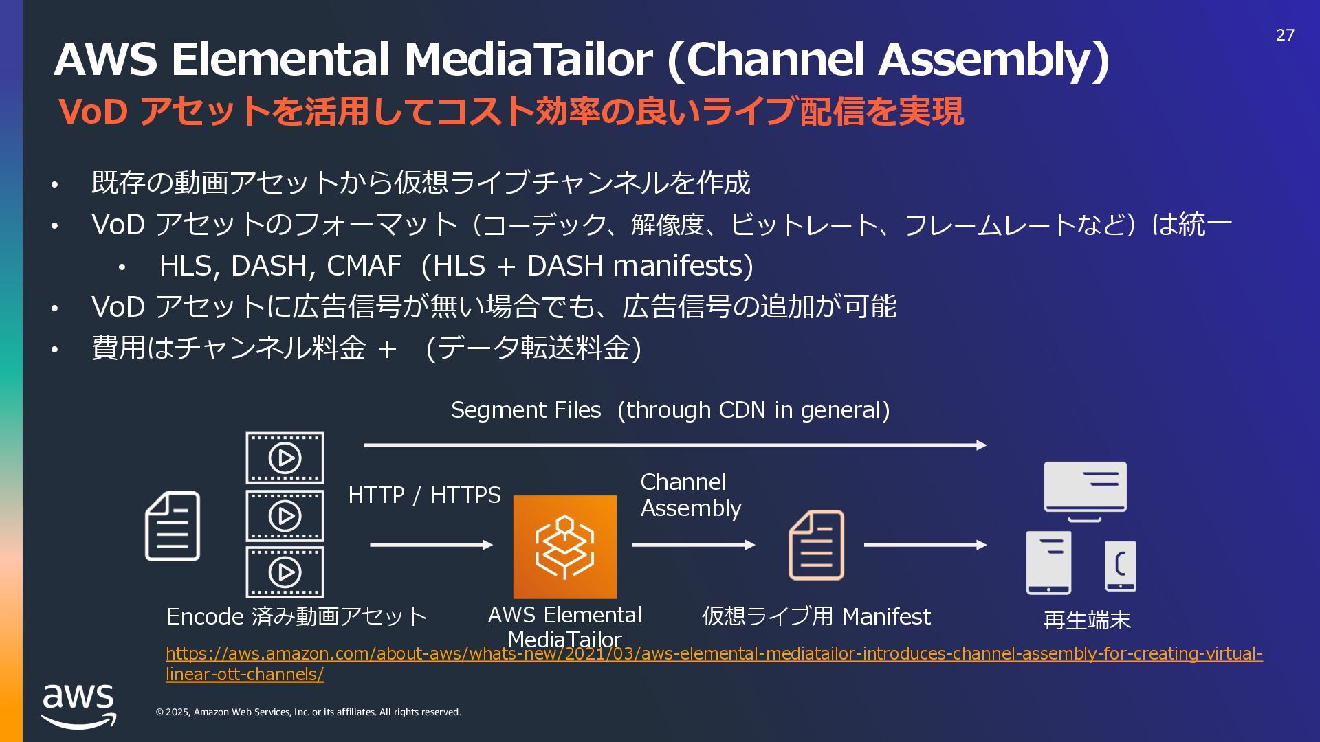 rights reserved. リソース 3 ・AWS Media & Entertainment Blog https://aws.amazon.com/jp/blogs/news/category/industries/entertainment/ Amazon Interactive Video Service – Add Live Video to Your Apps and Websites ・ https://aws.amazon.com/jp/blogs/aws/amazon-interactive-video-service-add-live-video-to-your-apps-and- websites/ Setting up for streaming with Amazon Interactive Video Service tps://aws.amazon.com/jp/blogs/media/setting-up-for-streaming-with-amazon-ivs/ ・メディアサービスのデジタルトレーニング https://aws.amazon.com/jp/training/path-mediaservices/ 56
