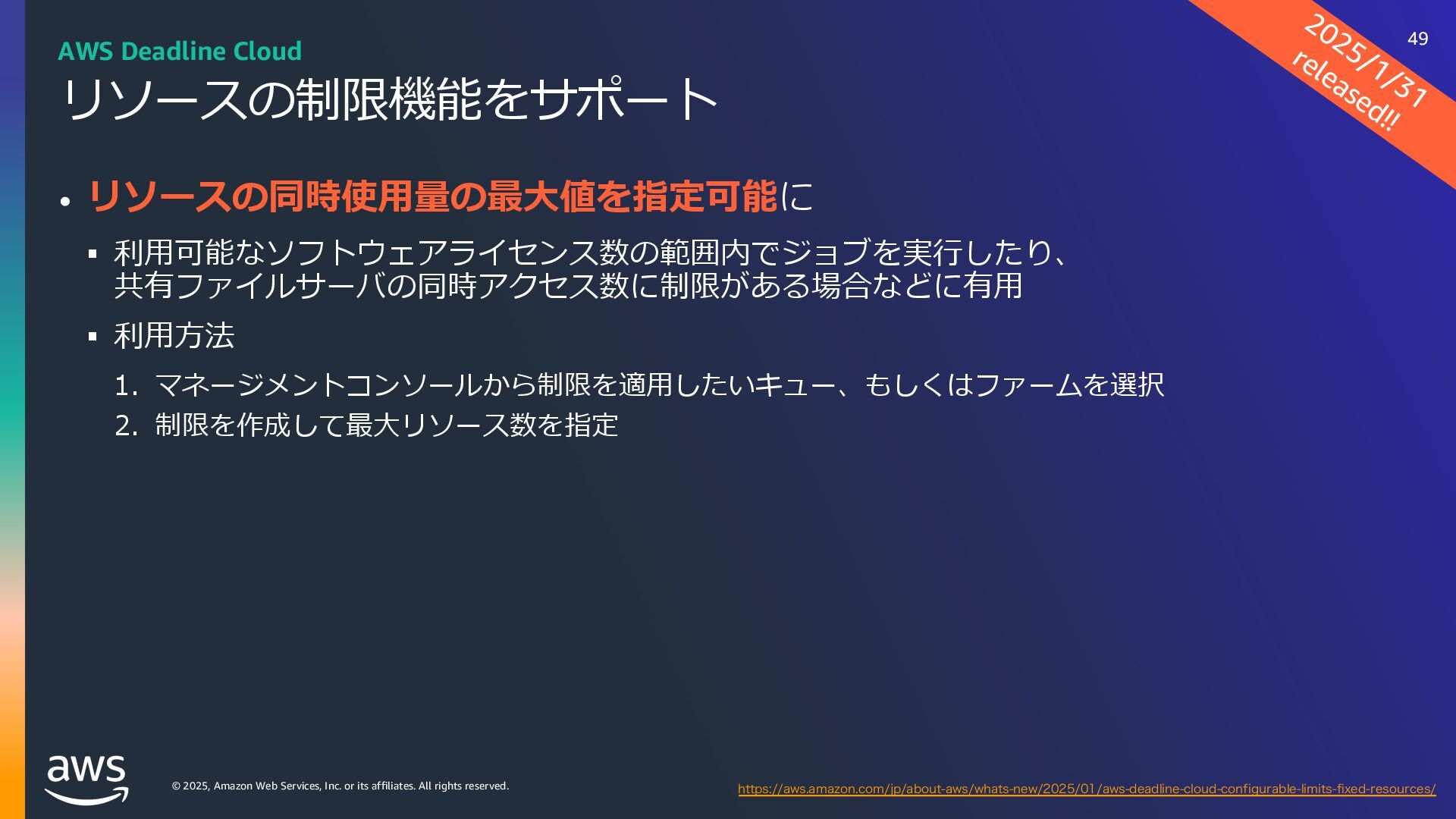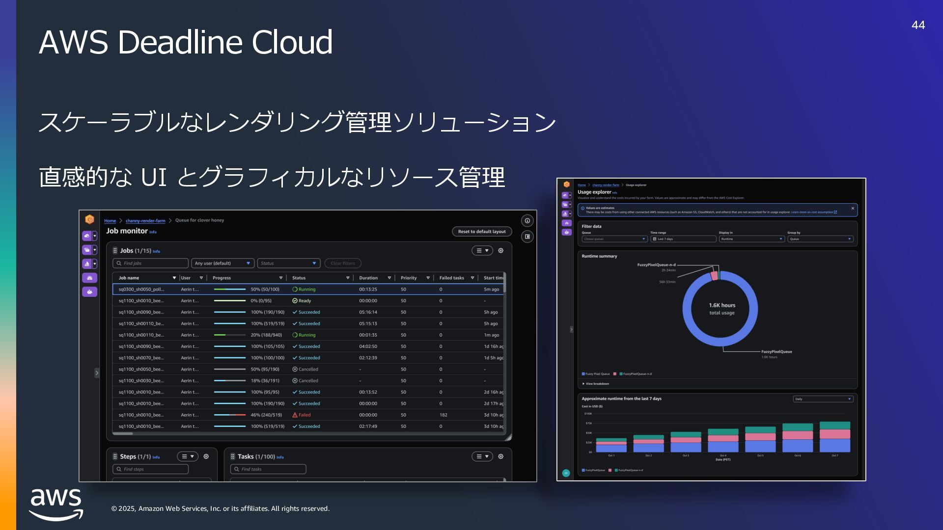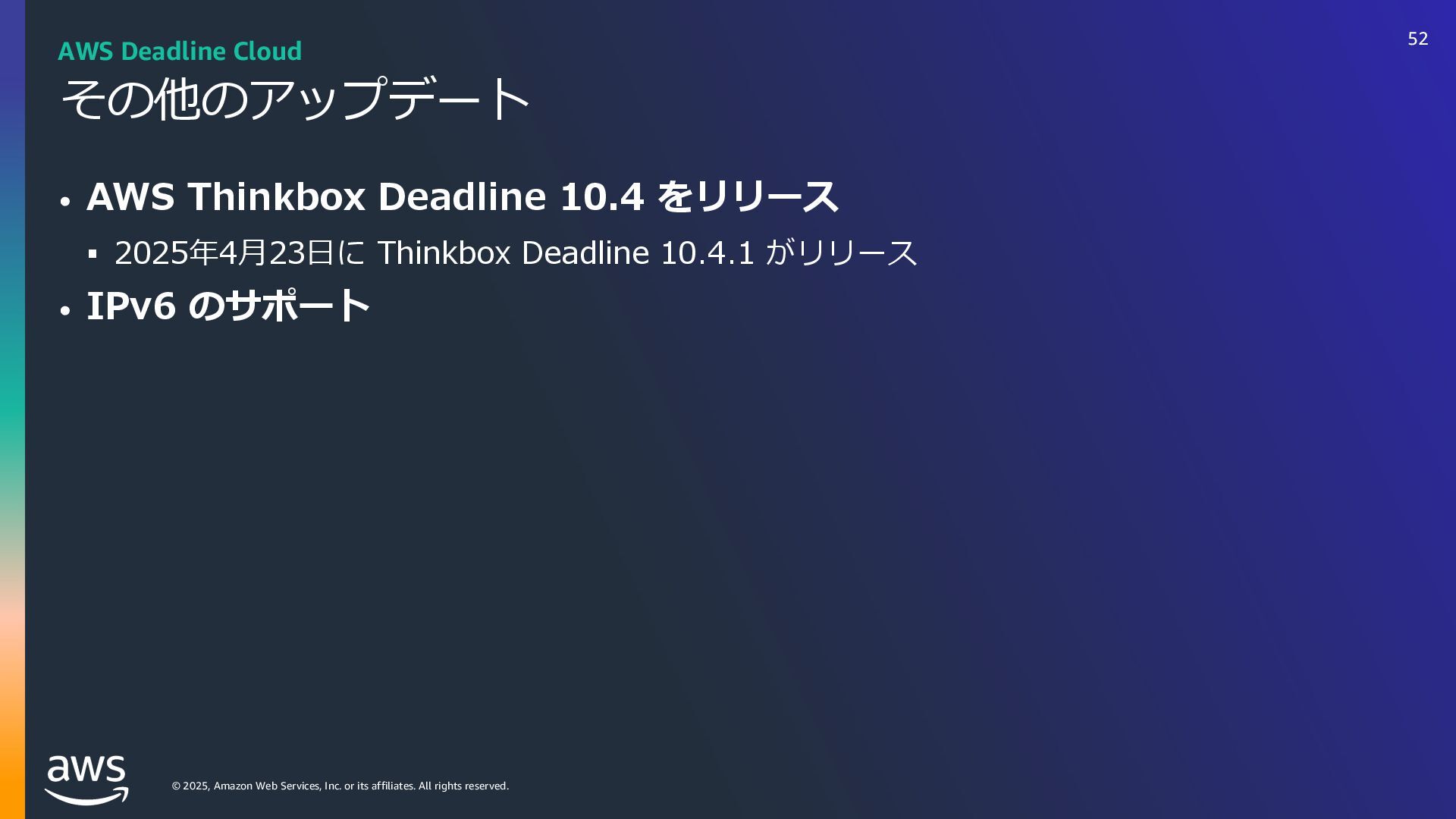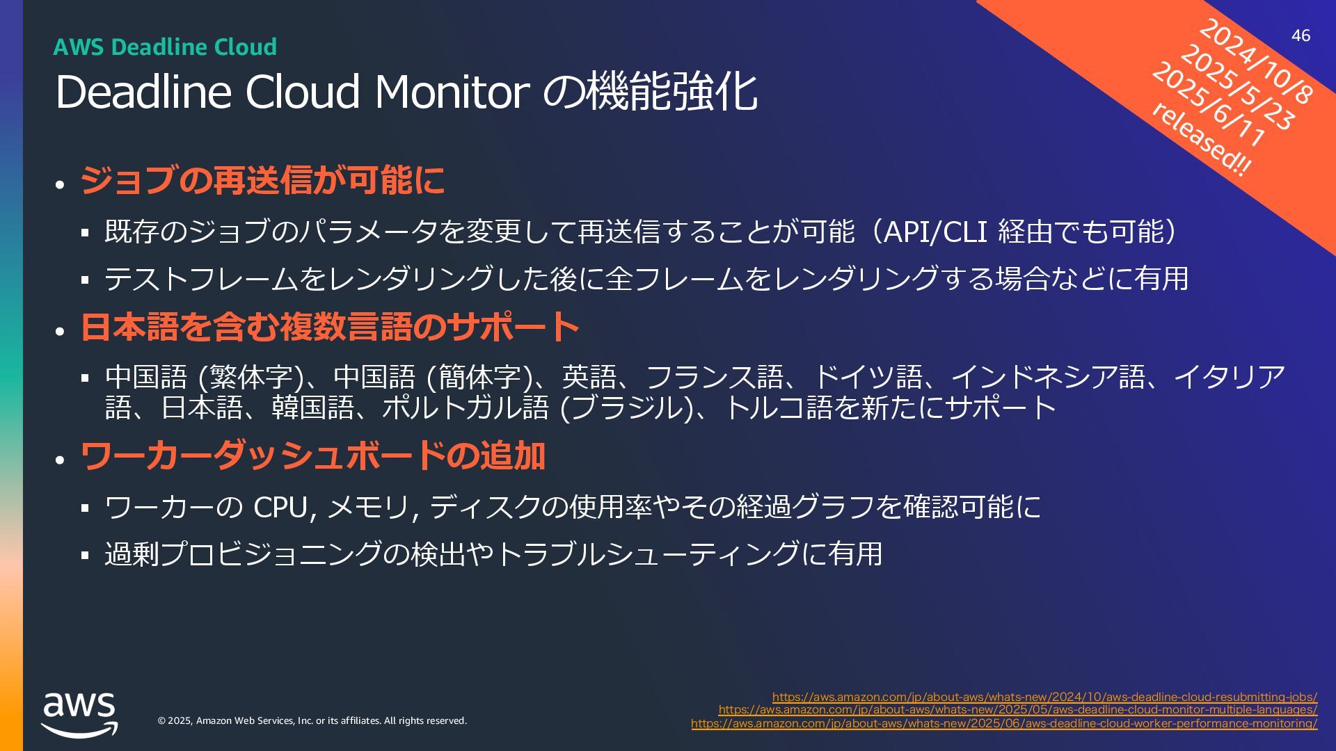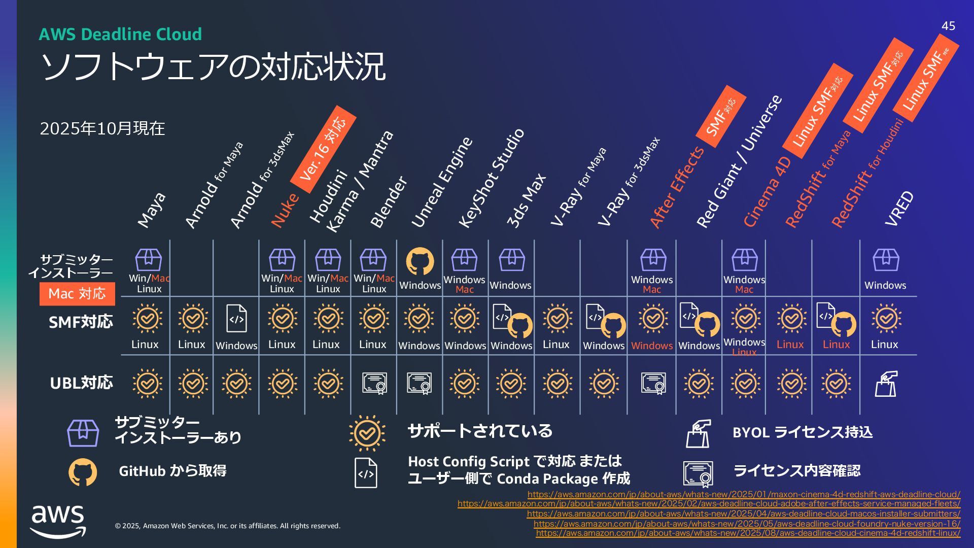 rights reserved. ソフトウェアの対応状況 2025年10⽉現在 45 AWS Deadline Cloud IUUQTBXTBNB[PODPNKQBCPVUBXTXIBUTOFXNBYPODJOFNBESFETIJGUBXTEFBEMJOFDMPVE IUUQTBXTBNB[PODPNKQBCPVUBXTXIBUTOFXBXTEFBEMJOFDMPVEBEPCFBGUFSFGGFDUTTFSWJDFNBOBHFEGMFFUT IUUQTBXTBNB[PODPNKQBCPVUBXTXIBUTOFXBXTEFBEMJOFDMPVENBDPTJOTUBMMFSTVCNJUUFST IUUQTBXTBNB[PODPNKQBCPVUBXTXIBUTOFXBXTEFBEMJOFDMPVEGPVOESZOVLFWFSTJPO IUUQTBXTBNB[PODPNKQBCPVUBXTXIBUTOFXBXTEFBEMJOFDMPVEDJOFNBESFETIJGUMJOVY Linux SMF 対 応 サブミッター インストーラーあり サポートされている UBL対応 Maya Arnold for Maya Houdini Karma / Mantra Blender V-Ray for Maya Unreal Engine KeyShot Studio 3ds Max After Effects Nuke GitHub から取得 Host Config Script で対応 または ユーザー側で Conda Package 作成 BYOL ライセンス持込 ライセンス内容確認 Red Giant / Universe Linux VRED Linux Cinema 4D RedShift for Maya Linux Linux Linux Linux Linux Windows Windows Mac Windows Mac Windows Windows Mac Windows Linux Windows V-Ray for 3dsMax Arnold for 3dsMax Windows Windows Windows Windows Windows Windows Linux SMF対応 サブミッター インストーラー Win/Mac Linux Win/Mac Linux Win/Mac Linux Win/Mac Linux Windows Linux RedShift for Houdini Ver.16 対 応 SMF 対 応 Linux SMF 対 応 Linux SMF 対 応 Mac 対応