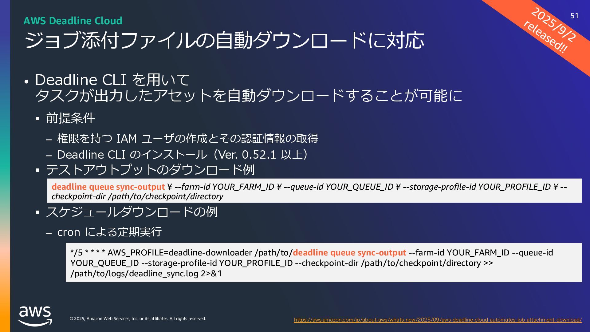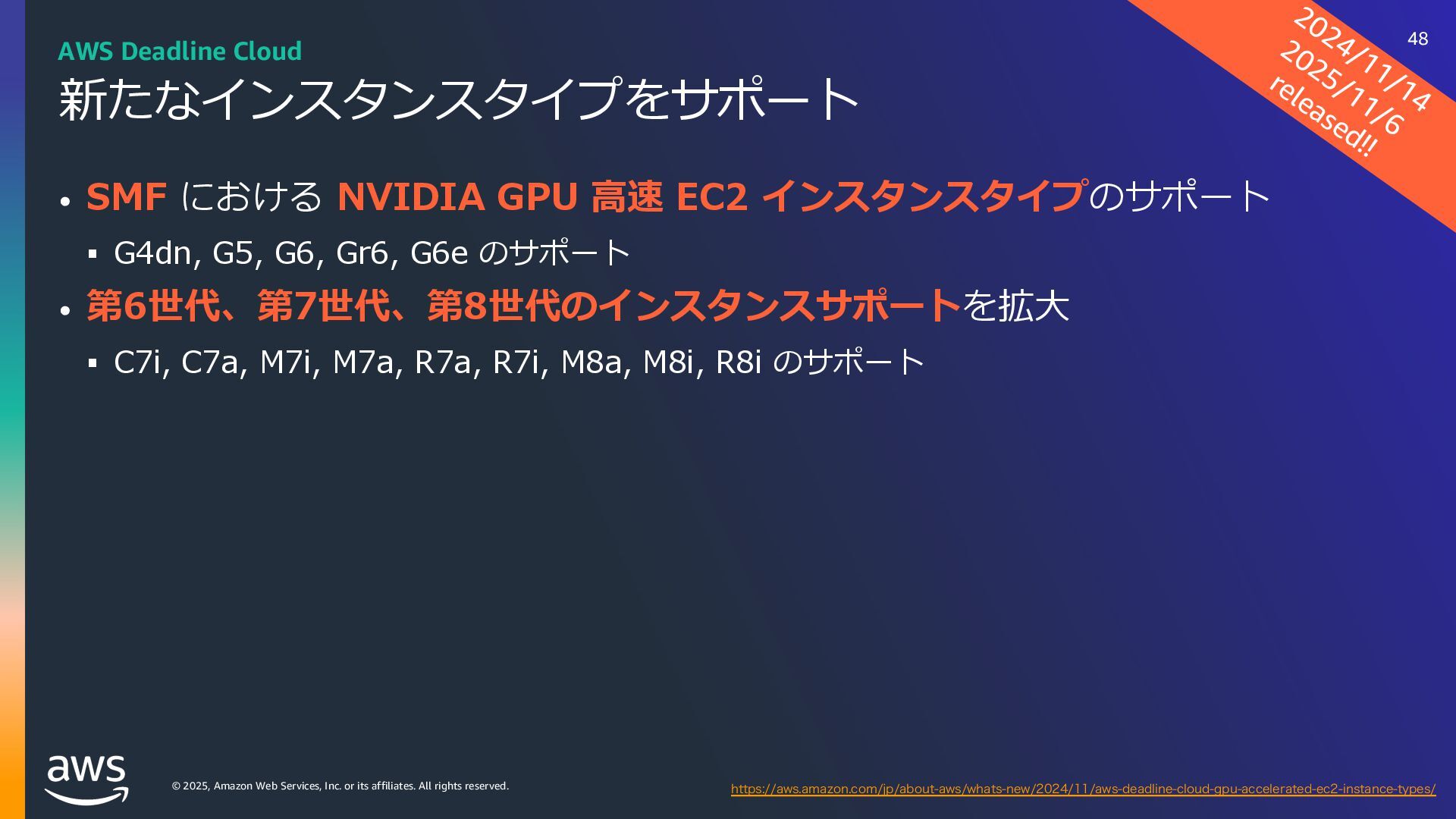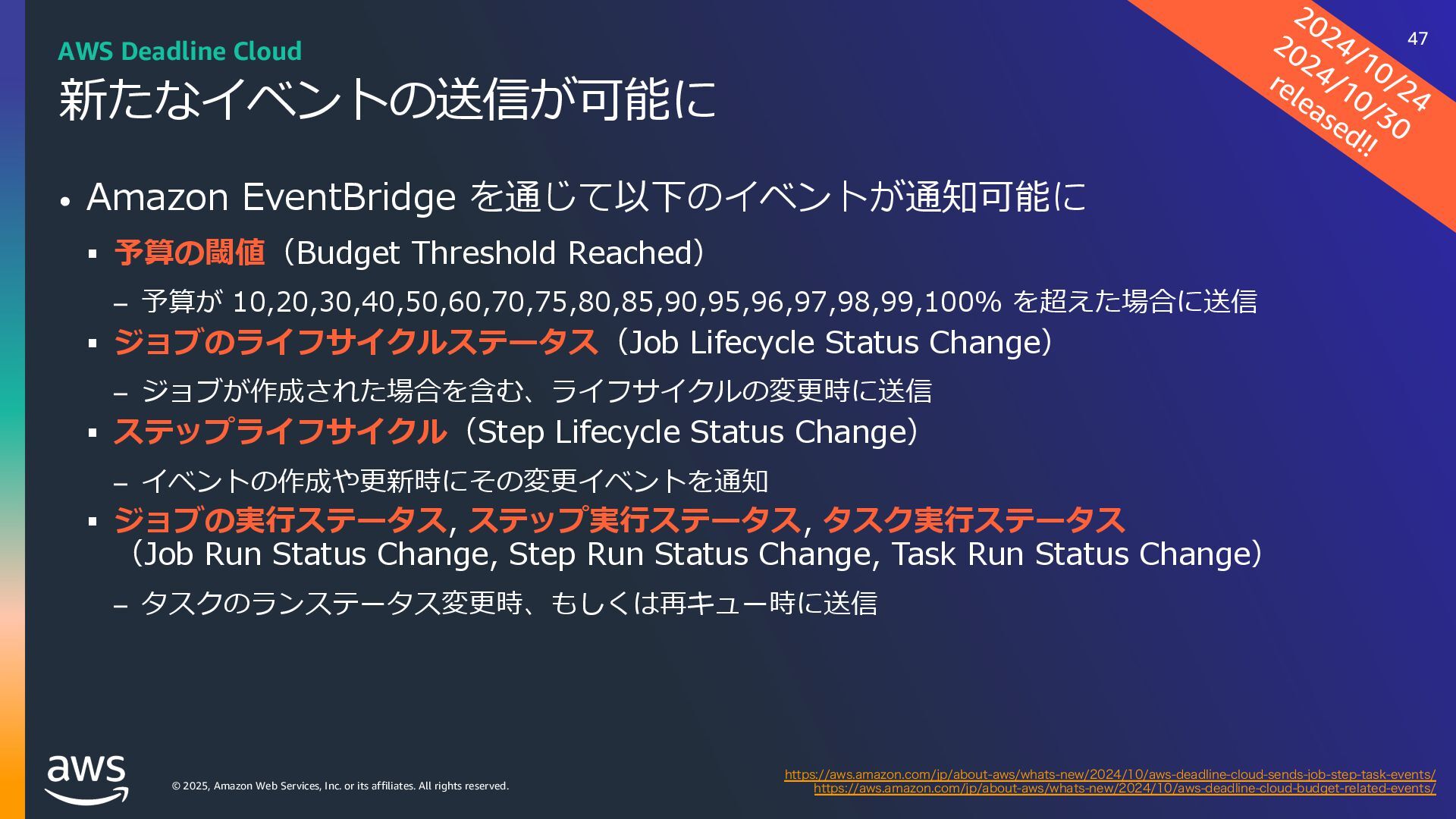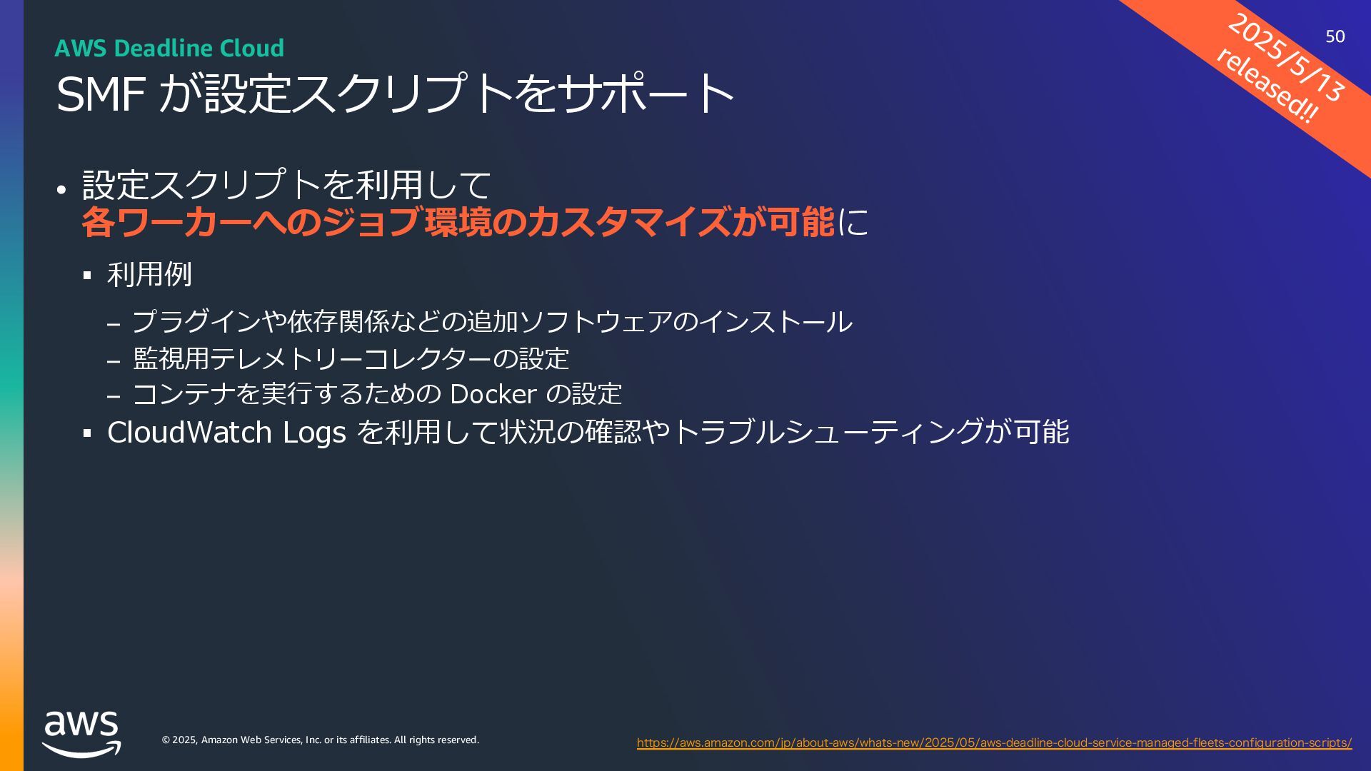 rights reserved. ソフトウェアの対応状況 2025年10⽉現在 45 AWS Deadline Cloud IUUQTBXTBNB[PODPNKQBCPVUBXTXIBUTOFXNBYPODJOFNBESFETIJGUBXTEFBEMJOFDMPVE IUUQTBXTBNB[PODPNKQBCPVUBXTXIBUTOFXBXTEFBEMJOFDMPVEBEPCFBGUFSFGGFDUTTFSWJDFNBOBHFEGMFFUT IUUQTBXTBNB[PODPNKQBCPVUBXTXIBUTOFXBXTEFBEMJOFDMPVENBDPTJOTUBMMFSTVCNJUUFST IUUQTBXTBNB[PODPNKQBCPVUBXTXIBUTOFXBXTEFBEMJOFDMPVEGPVOESZOVLFWFSTJPO IUUQTBXTBNB[PODPNKQBCPVUBXTXIBUTOFXBXTEFBEMJOFDMPVEDJOFNBESFETIJGUMJOVY Linux SMF 対 応 サブミッター インストーラーあり サポートされている UBL対応 Maya Arnold for Maya Houdini Karma / Mantra Blender V-Ray for Maya Unreal Engine KeyShot Studio 3ds Max After Effects Nuke GitHub から取得 Host Config Script で対応 または ユーザー側で Conda Package 作成 BYOL ライセンス持込 ライセンス内容確認 Red Giant / Universe Linux VRED Linux Cinema 4D RedShift for Maya Linux Linux Linux Linux Linux Windows Windows Mac Windows Mac Windows Windows Mac Windows Linux Windows V-Ray for 3dsMax Arnold for 3dsMax Windows Windows Windows Windows Windows Windows Linux SMF対応 サブミッター インストーラー Win/Mac Linux Win/Mac Linux Win/Mac Linux Win/Mac Linux Windows Linux RedShift for Houdini Ver.16 対 応 SMF 対 応 Linux SMF 対 応 Linux SMF 対 応 Mac 対応