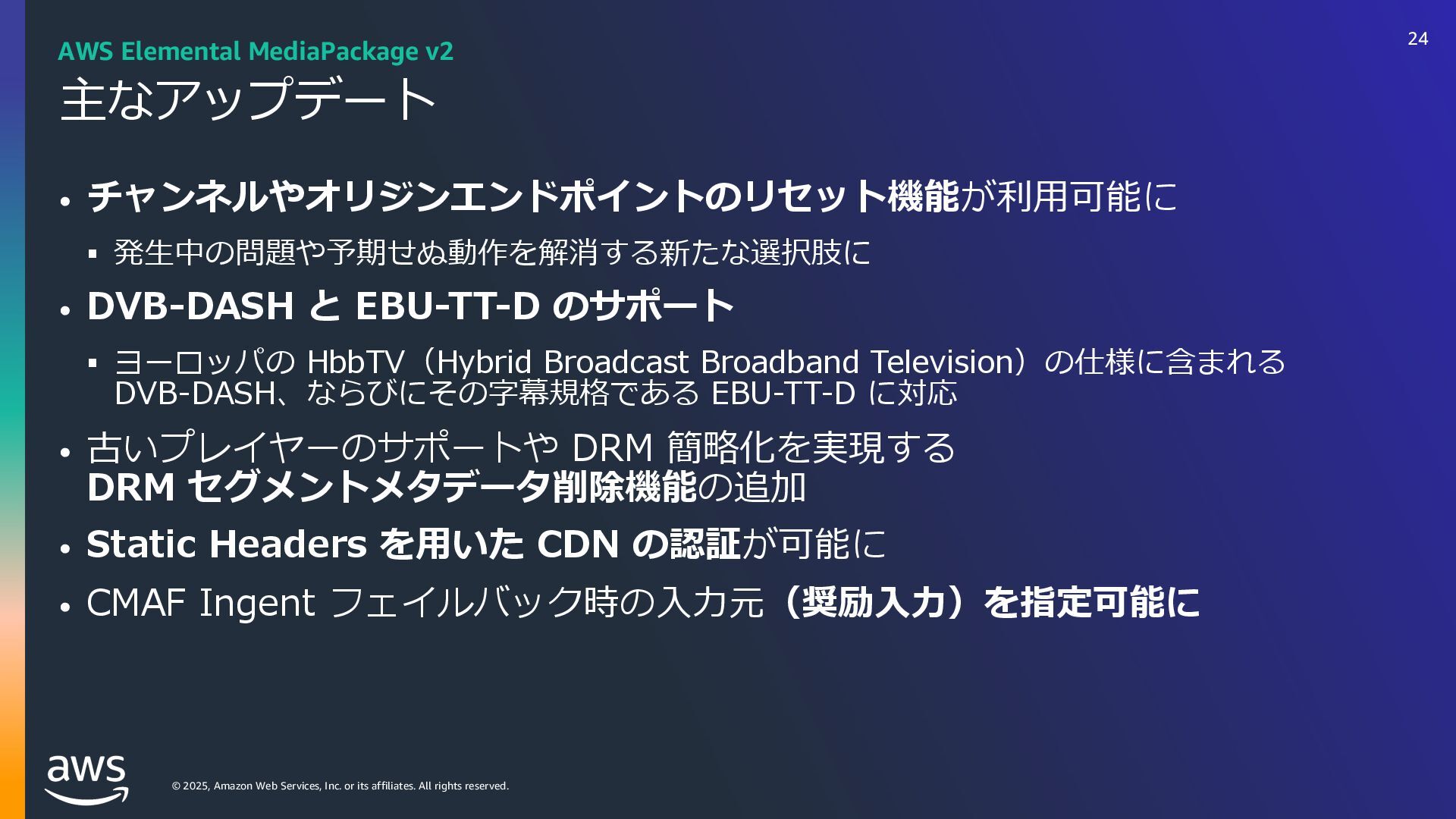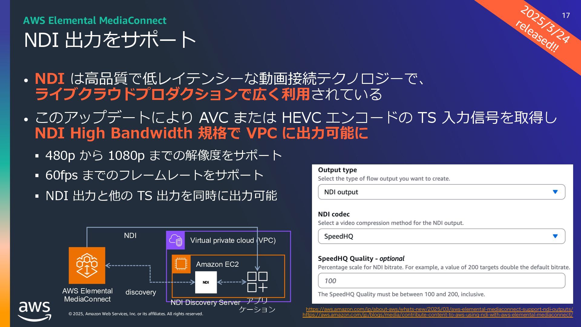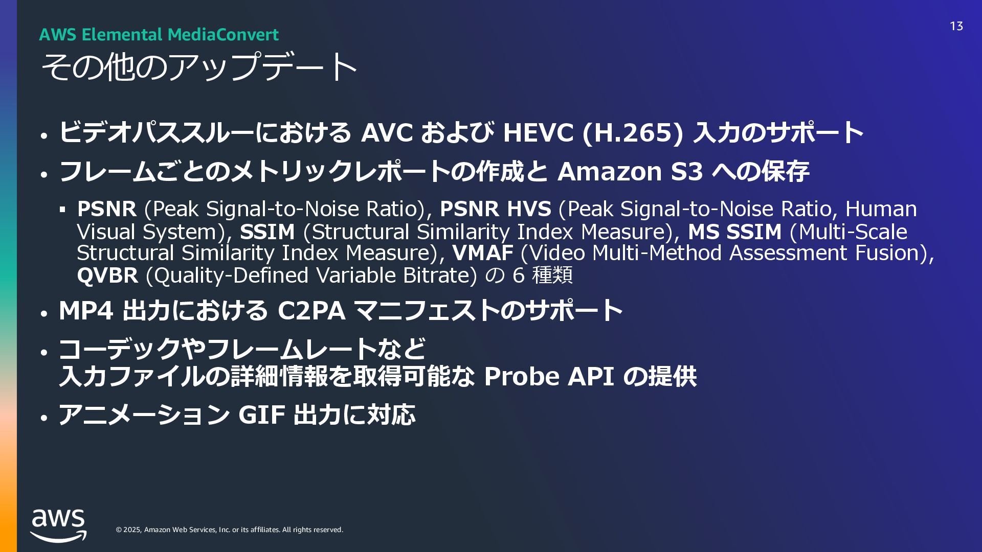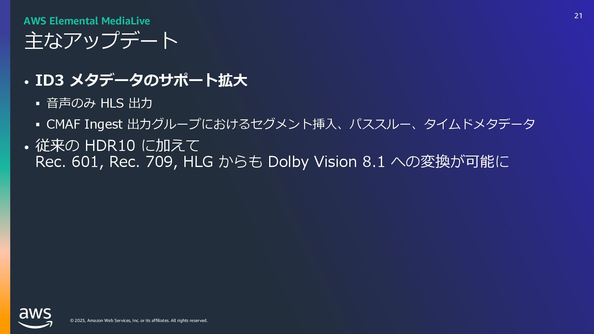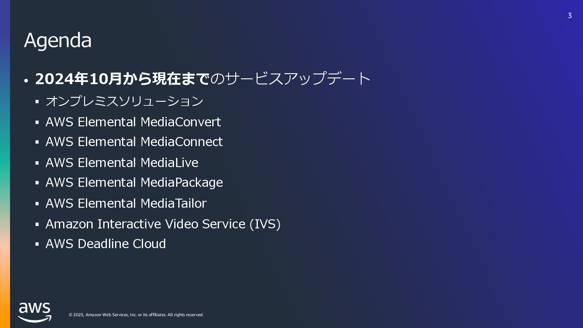rights reserved. ソフトウェアの対応状況 2025年10⽉現在 45 AWS Deadline Cloud IUUQTBXTBNB[PODPNKQBCPVUBXTXIBUTOFXNBYPODJOFNBESFETIJGUBXTEFBEMJOFDMPVE IUUQTBXTBNB[PODPNKQBCPVUBXTXIBUTOFXBXTEFBEMJOFDMPVEBEPCFBGUFSFGGFDUTTFSWJDFNBOBHFEGMFFUT IUUQTBXTBNB[PODPNKQBCPVUBXTXIBUTOFXBXTEFBEMJOFDMPVENBDPTJOTUBMMFSTVCNJUUFST IUUQTBXTBNB[PODPNKQBCPVUBXTXIBUTOFXBXTEFBEMJOFDMPVEGPVOESZOVLFWFSTJPO IUUQTBXTBNB[PODPNKQBCPVUBXTXIBUTOFXBXTEFBEMJOFDMPVEDJOFNBESFETIJGUMJOVY Linux SMF 対 応 サブミッター インストーラーあり サポートされている UBL対応 Maya Arnold for Maya Houdini Karma / Mantra Blender V-Ray for Maya Unreal Engine KeyShot Studio 3ds Max After Effects Nuke GitHub から取得 Host Config Script で対応 または ユーザー側で Conda Package 作成 BYOL ライセンス持込 ライセンス内容確認 Red Giant / Universe Linux VRED Linux Cinema 4D RedShift for Maya Linux Linux Linux Linux Linux Windows Windows Mac Windows Mac Windows Windows Mac Windows Linux Windows V-Ray for 3dsMax Arnold for 3dsMax Windows Windows Windows Windows Windows Windows Linux SMF対応 サブミッター インストーラー Win/Mac Linux Win/Mac Linux Win/Mac Linux Win/Mac Linux Windows Linux RedShift for Houdini Ver.16 対 応 SMF 対 応 Linux SMF 対 応 Linux SMF 対 応 Mac 対応