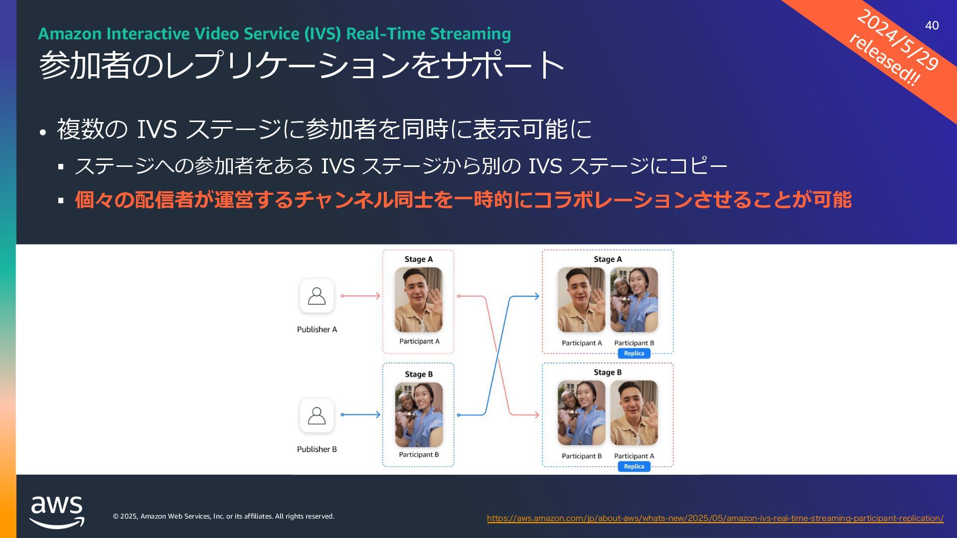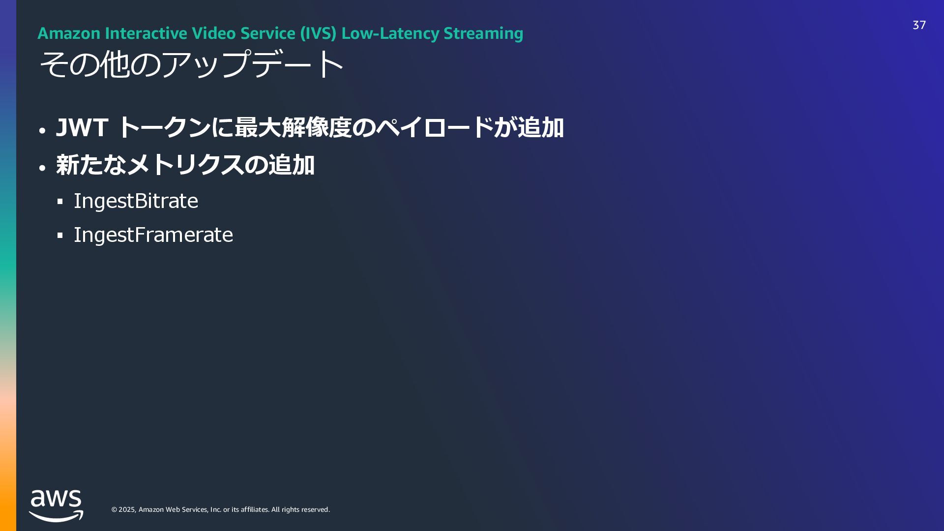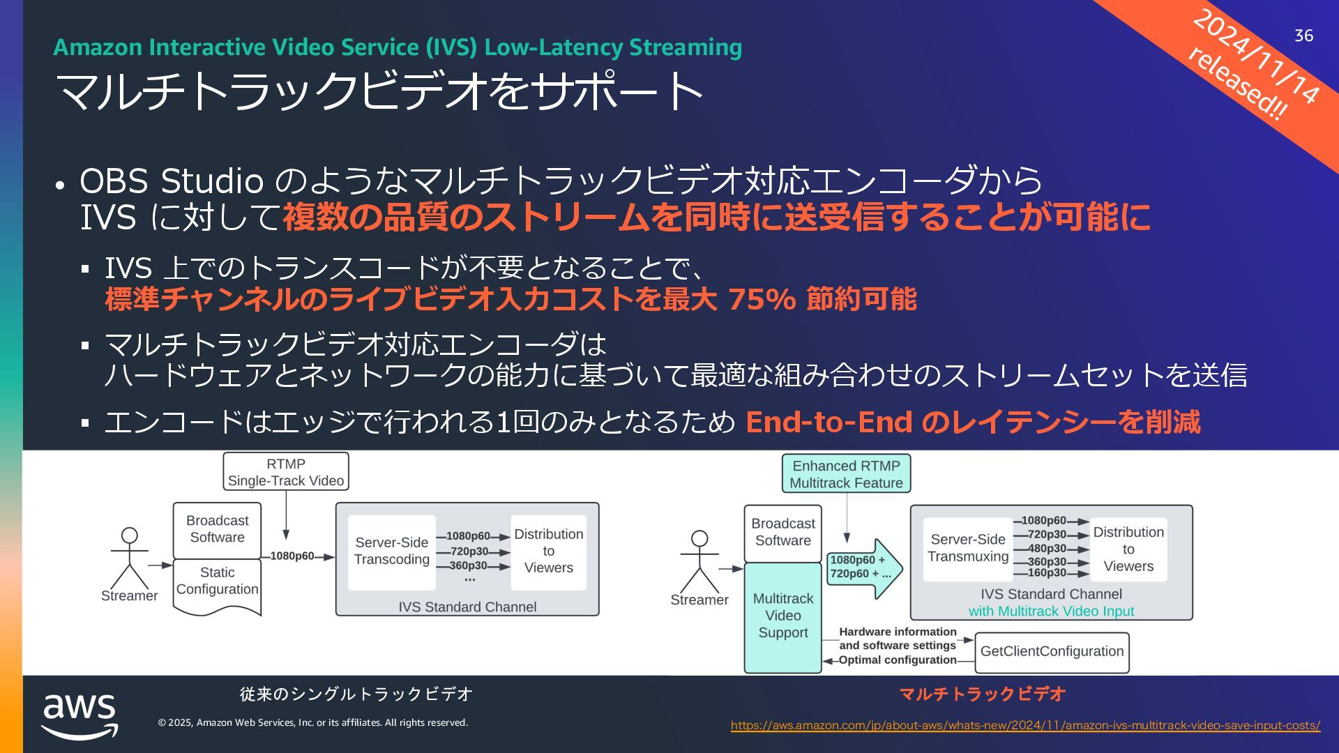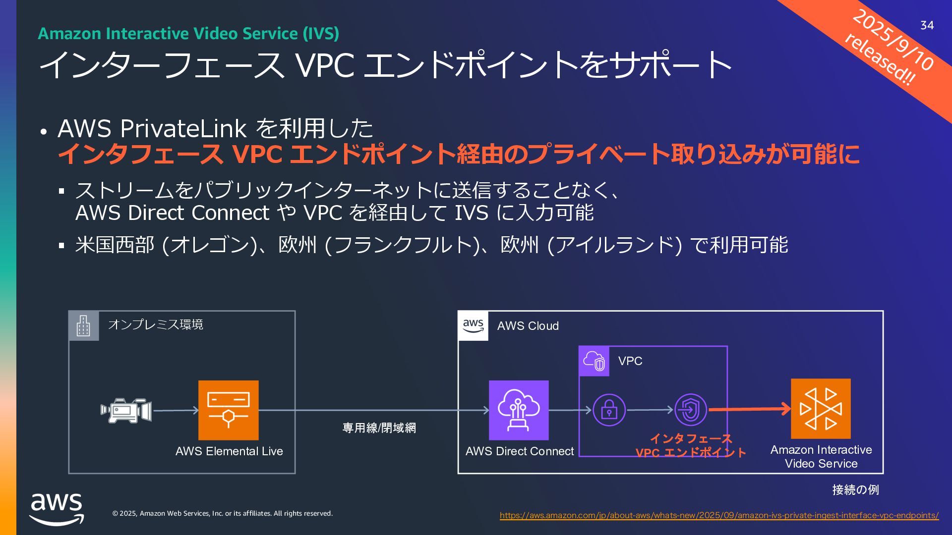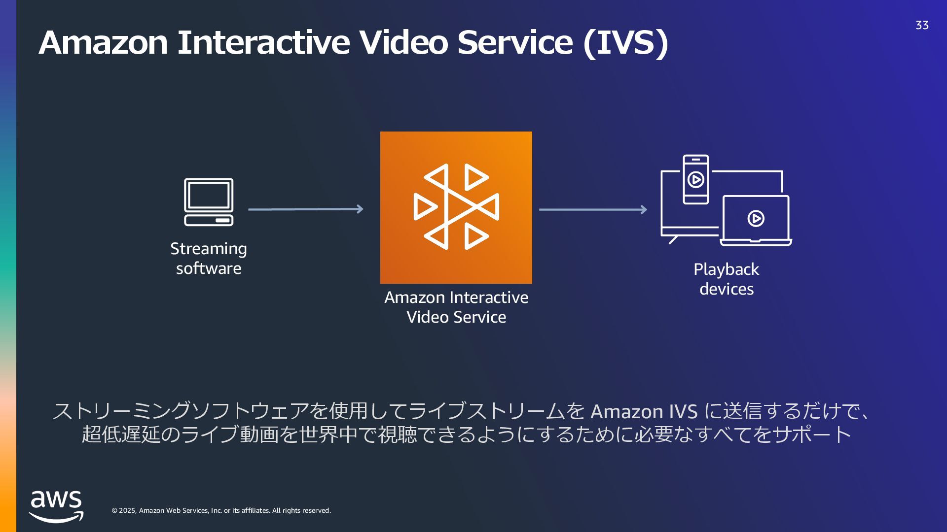 rights reserved. Amazon Interactive Video Service (IVS) ストリーミングソフトウェアを使⽤してライブストリームを Amazon IVS に送信するだけで、 超低遅延のライブ動画を世界中で視聴できるようにするために必要なすべてをサポート Streaming software Playback devices Amazon Interactive Video Service 33