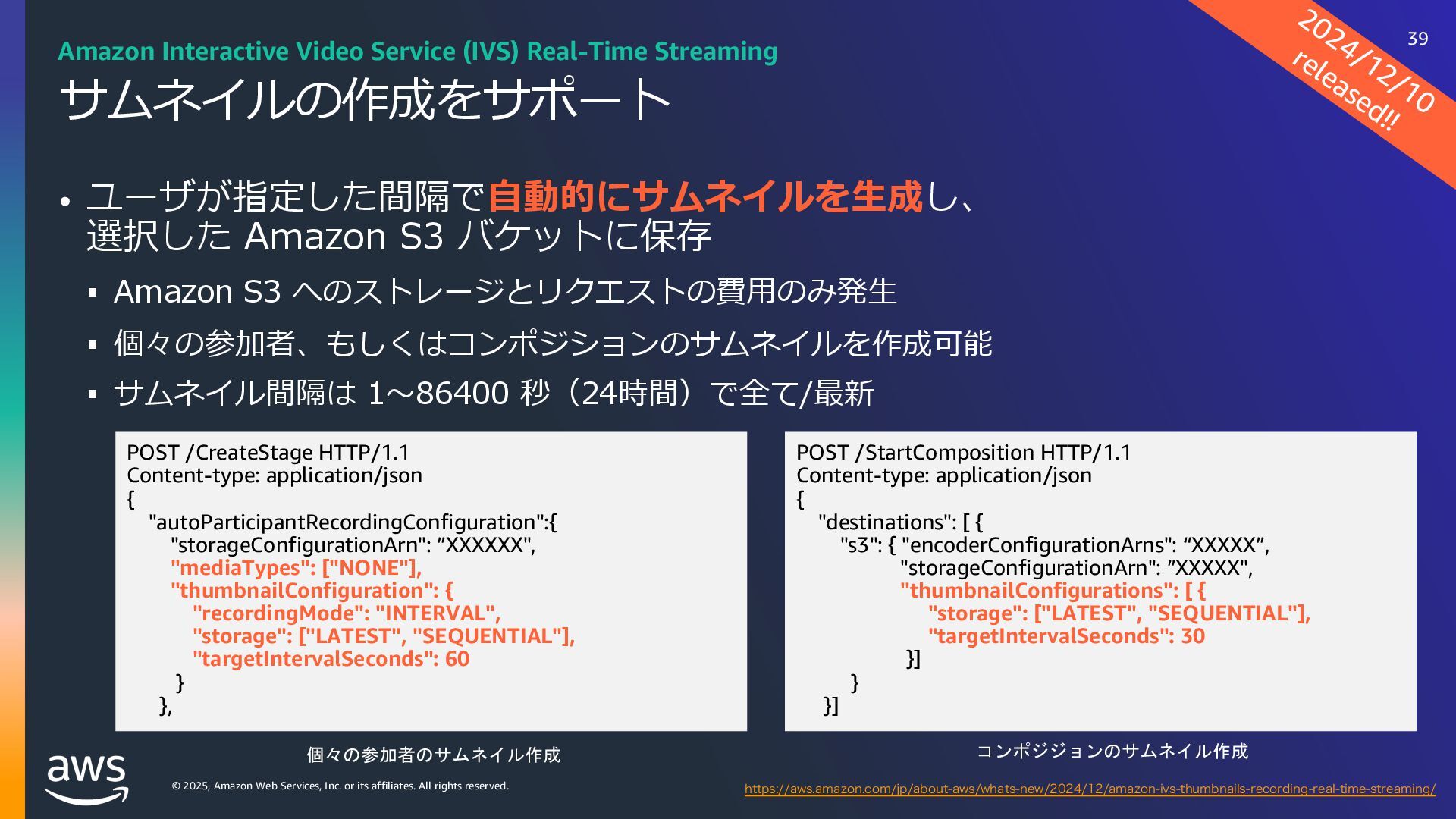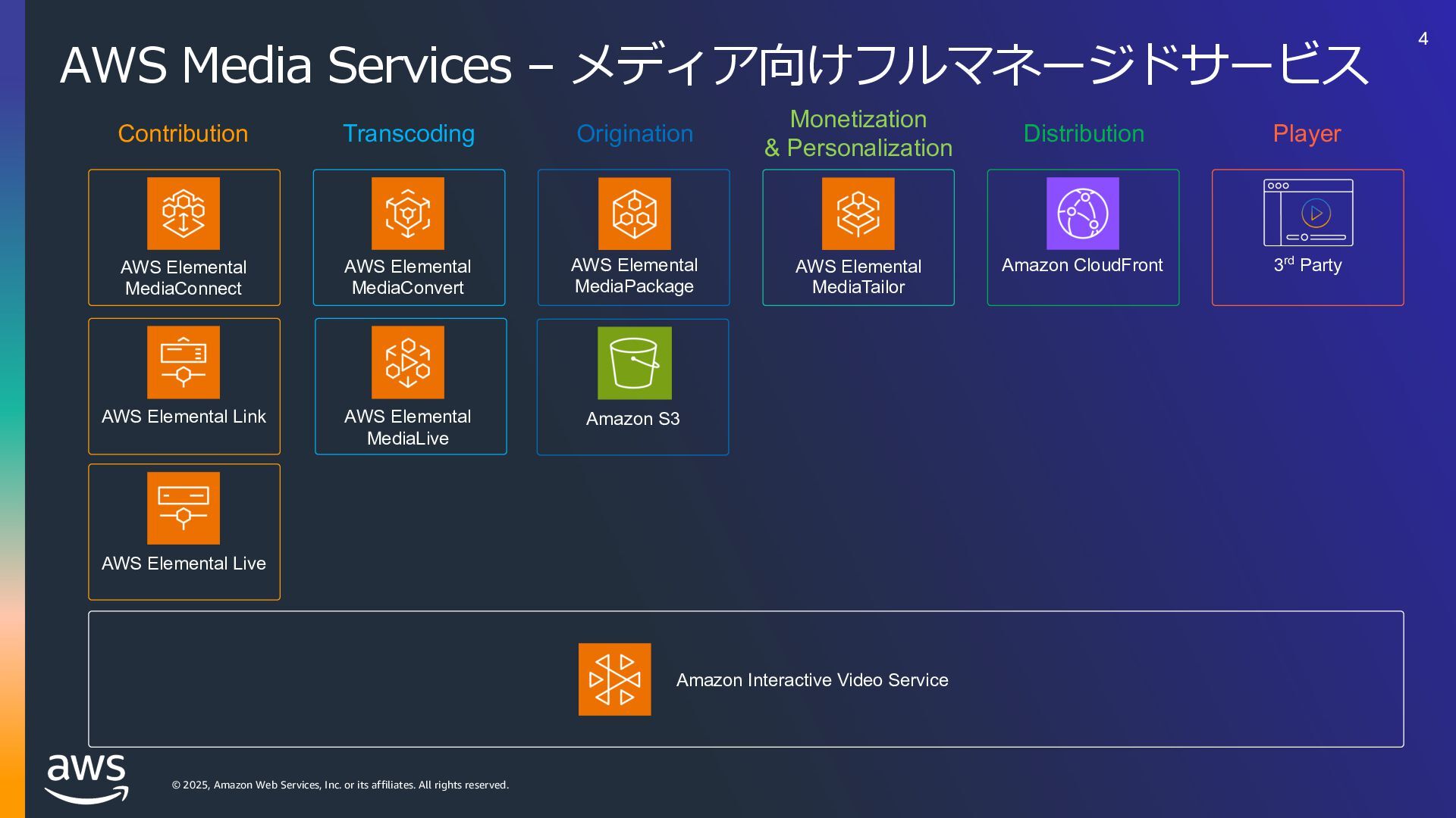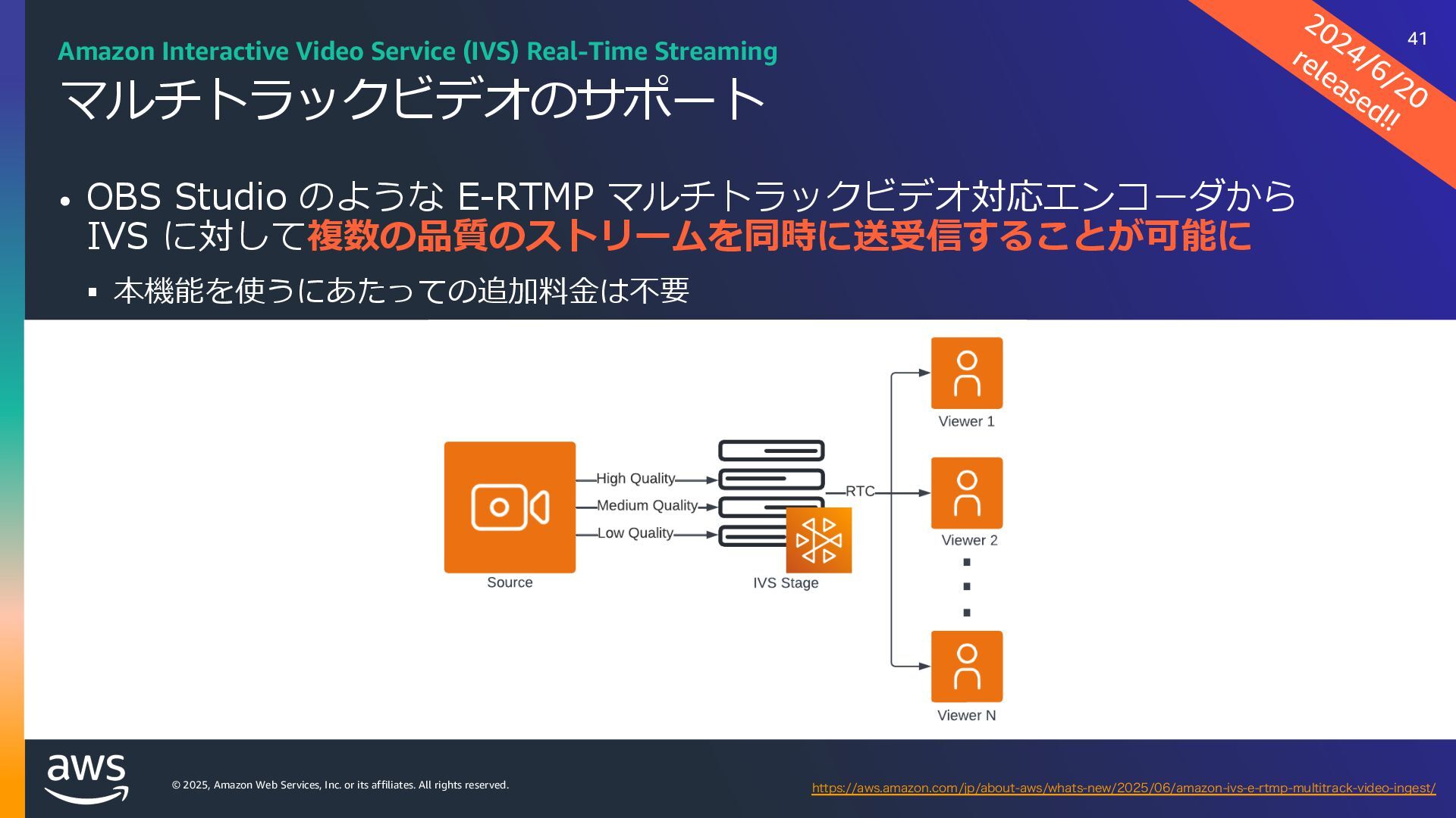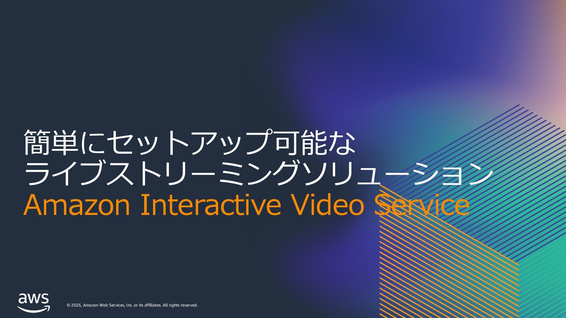 rights reserved. Amazon Interactive Video Service (IVS) ストリーミングソフトウェアを使⽤してライブストリームを Amazon IVS に送信するだけで、 超低遅延のライブ動画を世界中で視聴できるようにするために必要なすべてをサポート Streaming software Playback devices Amazon Interactive Video Service 33