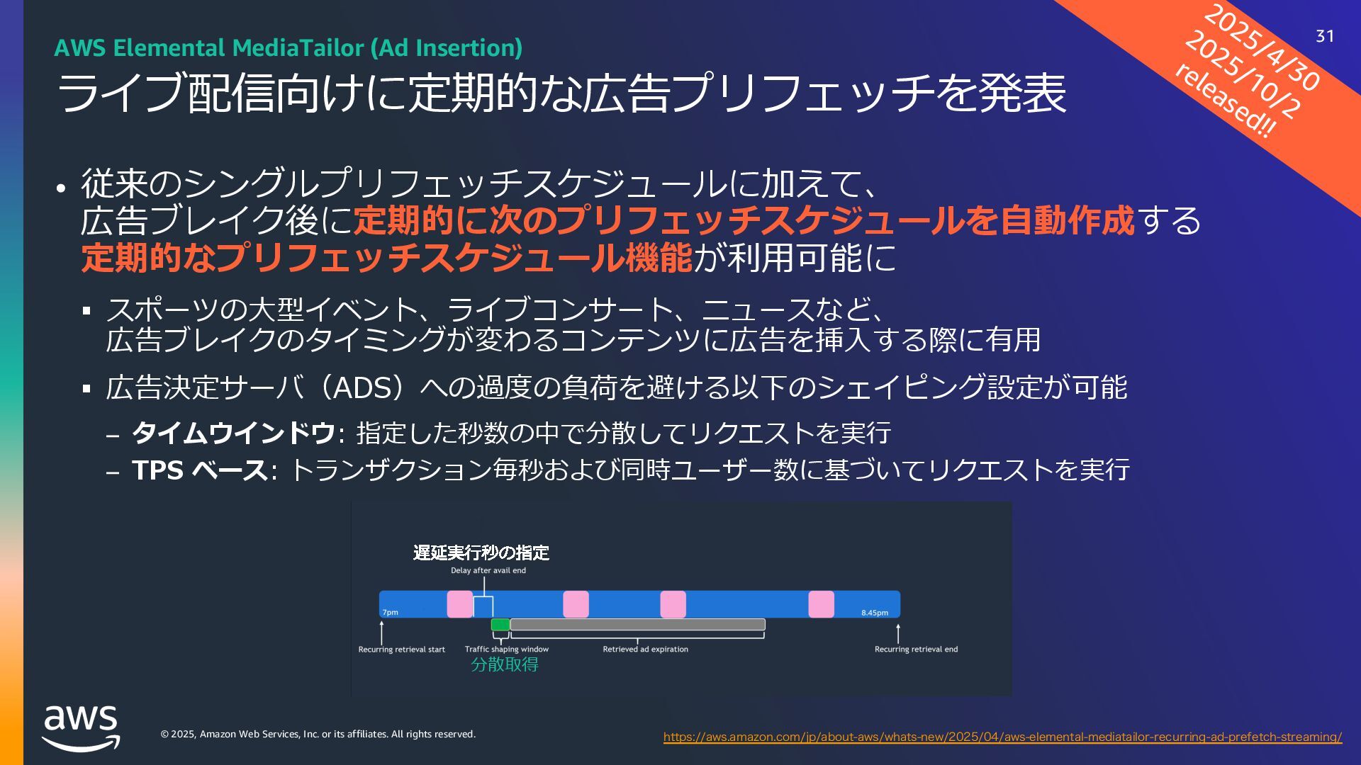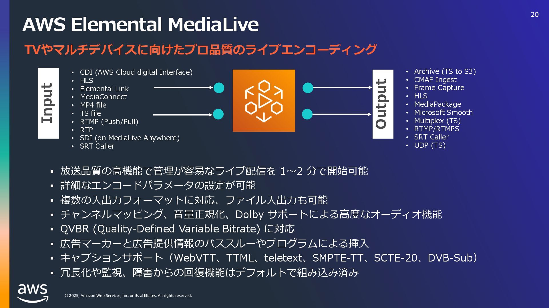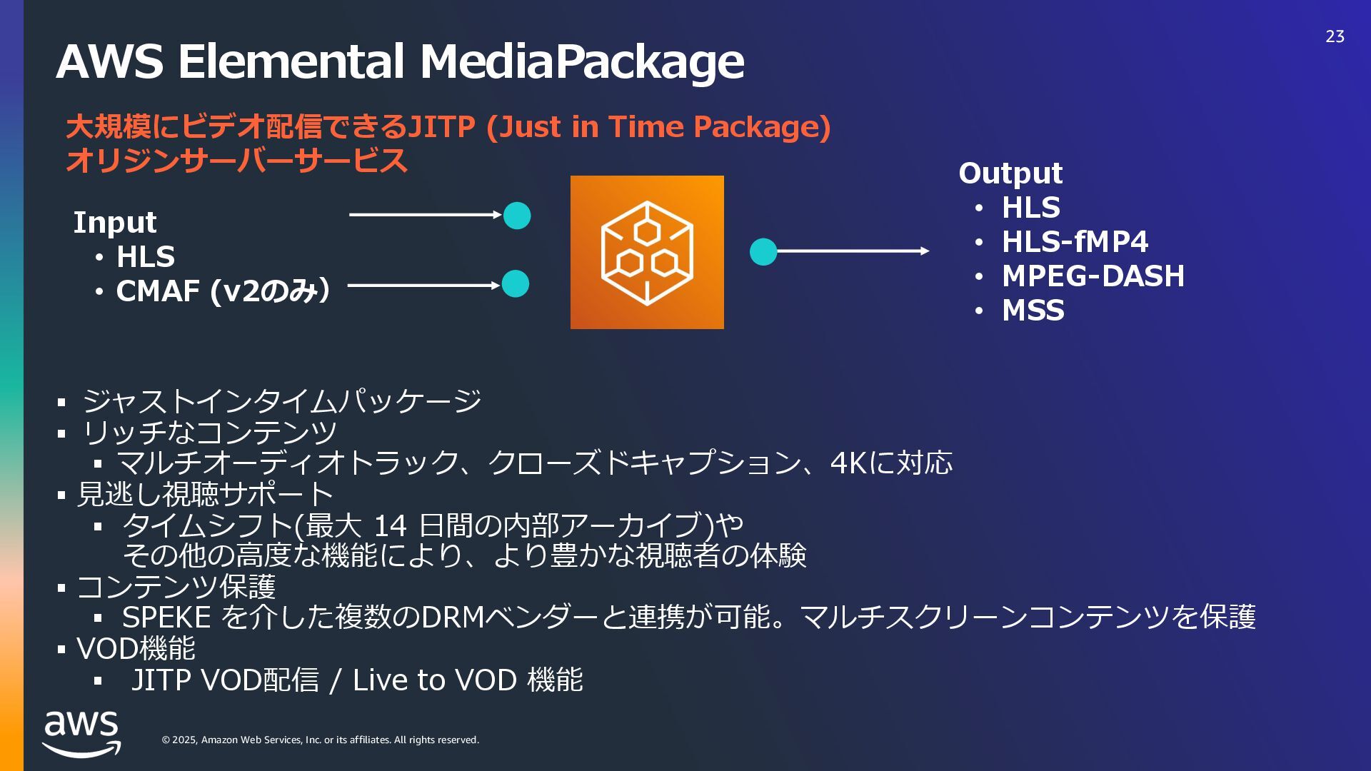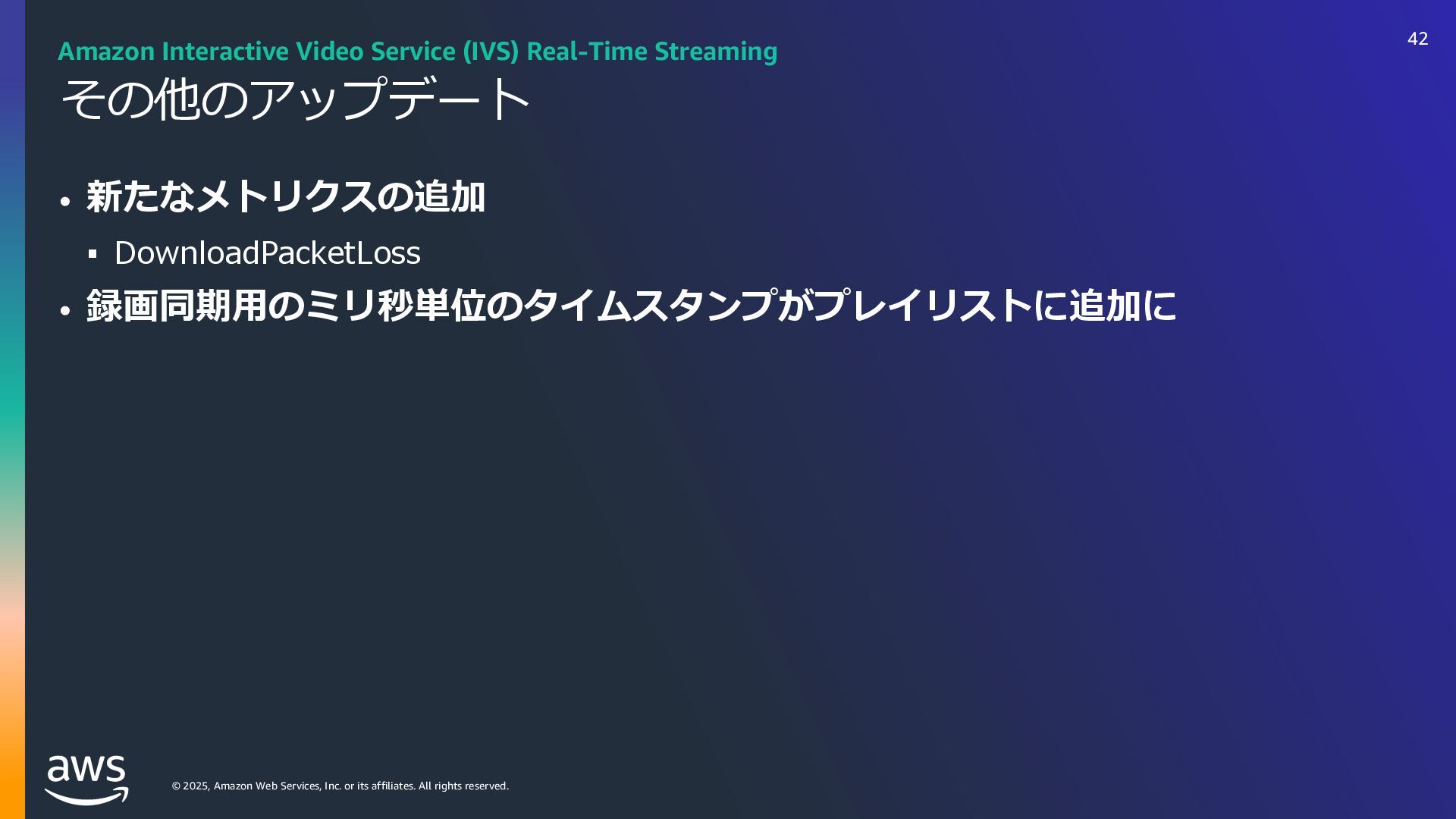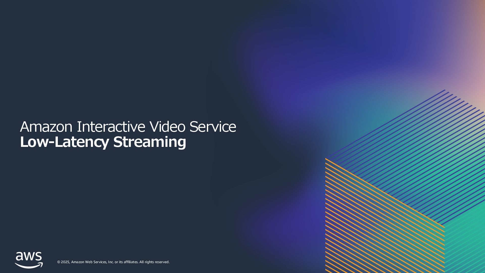 rights reserved. Amazon Interactive Video Service (IVS) ストリーミングソフトウェアを使⽤してライブストリームを Amazon IVS に送信するだけで、 超低遅延のライブ動画を世界中で視聴できるようにするために必要なすべてをサポート Streaming software Playback devices Amazon Interactive Video Service 33