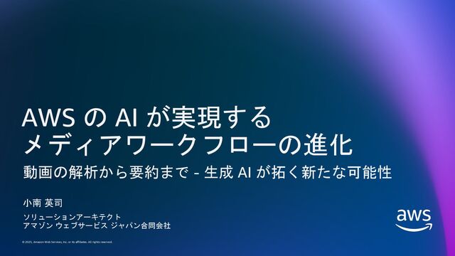 rights reserved. 1 © 2025, Amazon Web Services, Inc. or its affiliates. All rights reserved. AWS の AI が実現する メディアワークフローの進化 動画の解析から要約まで - 生成 AI が拓く新たな可能性 小南 英司 ソリューションアーキテクト アマゾン ウェブサービス ジャパン合同会社