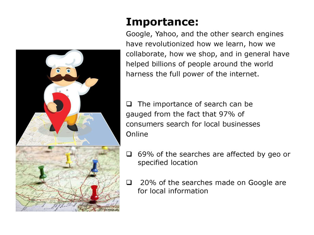 how we learn, how we collaborate, how we shop, and in general have helped billions of people around the world harness the full power of the internet. The importance of search can be gauged from the fact that 97% of consumers search for local businesses Online 69% of the searches are affected by geo or specified location 20% of the searches made on Google are for local information