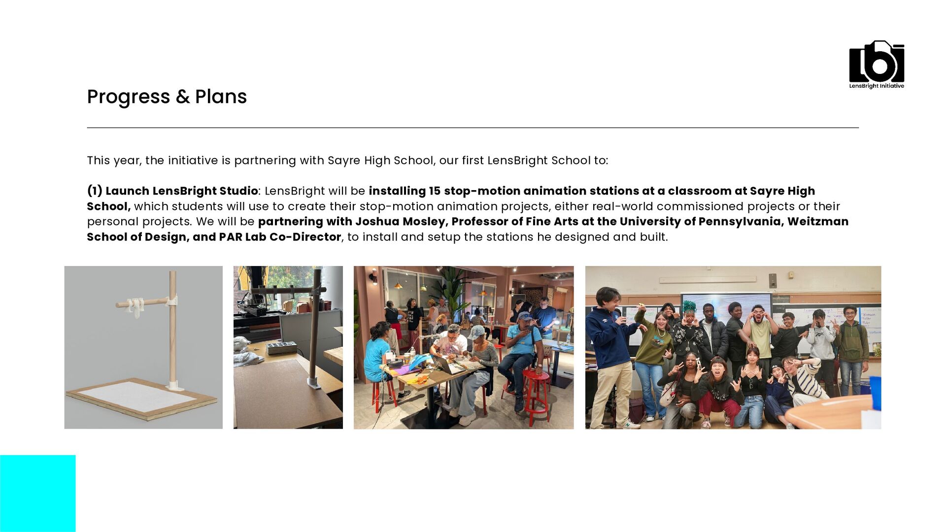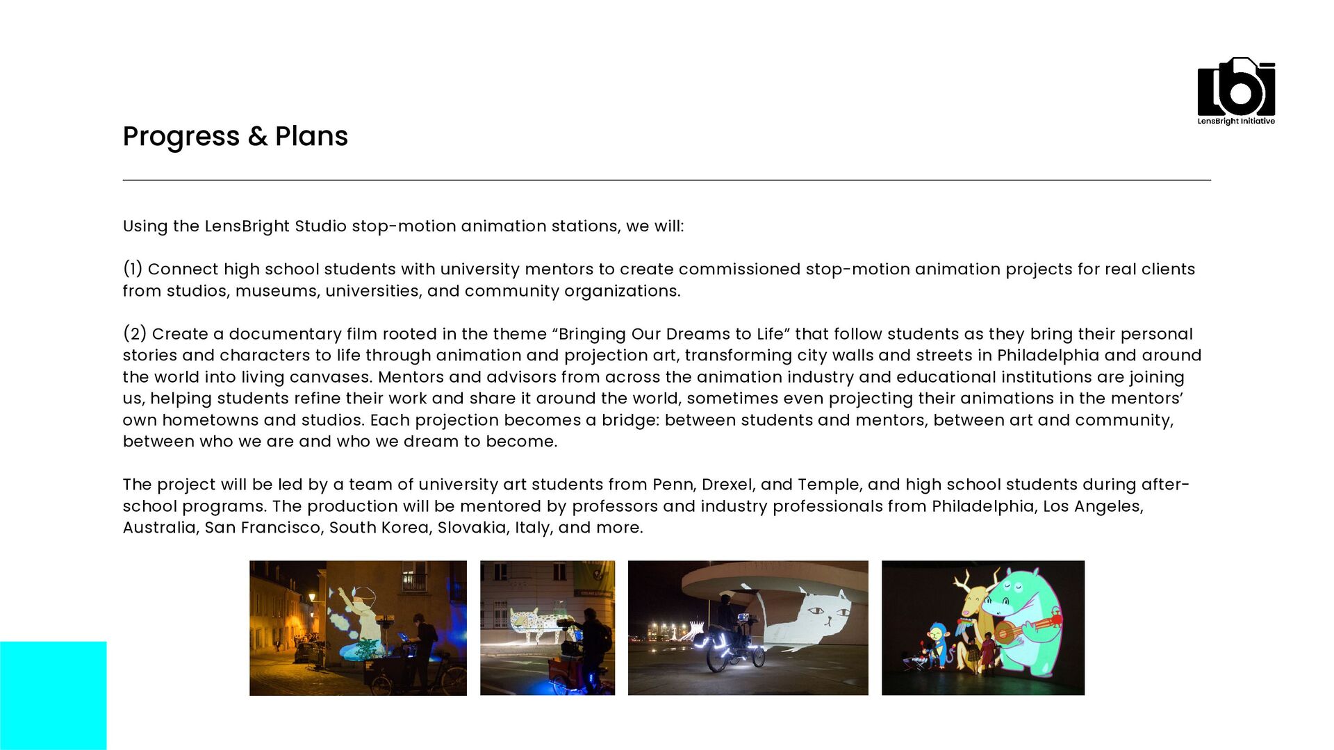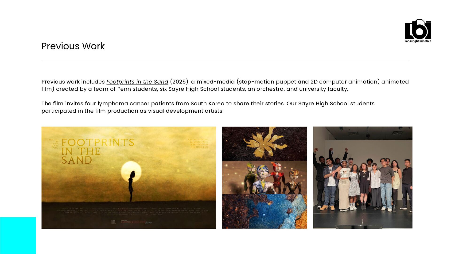 national, and international public art installation and exhibition opportunities to support students’ growth as lens-based artists. Providing real-world commissioned projects from industry, community, and educational partners, mentored by university students, to offer hands-on experience and foster professional skill development. Programming Plan 2025-26 Connecting students with network of professionals and tailored internship and shadowing opportunities in industry, community, and educational settings to facilitate their tangible next steps within the industry and beyond. Expected Outcomes for 2025-26: Completion of three public art and exhibition projects at local, national, and international levels. Confirmed: Philadelphia, San Francisco, Paris Expected Outcomes for 2025-26: Competition of five commissioned projects in photography, film, and animation. Expected Outcomes for 2025-26: Completion of one to two internship and/or shadowing opportunities. (1) Industry/Studio Maestro Filmworks Bowstring Production All Ages Productions Philadelphia Animation Film Festival Philadelphia Asian American Film Festival Sony Pictures Entertainment FFCP (Paris) Le Figargo (Paris) (2) Community Organization Youth Skills Building Program Walt Disney Family Museum PhAM - Philadelphia Art Museum Penn Athlete Media Team Public Trust - Listening Lab TILT PhlAir NGO (3) Educational Institution Sayre High School UACS School University of Pennsylvania (Netter Center, PADS Studio, President’s Office, PARLab, RealArts@Penn, SACHS Program) Temple University (Animation BFA Department) Moore College (Photography and Film Department) Drexel University (Dr. Edouard’s Film Lab) List of partner organizations we are planning on partnering for projects and opportunities: LensBright Initiative 2025-26 Program Outline 1 2 3 Previous work: PAAM’s previous work includes hosting five exhibitions and four sales over the past three years. Previous work: Created Footprints in the Sand (2025), an animated documentary film made with six students from Sayre High School, sharing the stories of four lymphoma patients. Previous work: Hosted 70+ mentorship and workshop sessions and organized five meetings with industry professionals from Sony, Pixar, LAIKA, DreamWorks, and ASIFA-Hollywood.