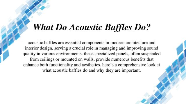 Acoustic baffles are essential components in modern architecture and interior design, serving a crucial role in managing and improving sound quality in various environments. These specialized panels, often suspended from ceilings or mounted on walls, provide numerous benefits that enhance both functionality and aesthetics. Here’s a comprehensive look at what acoustic baffles do and why they are important. https://silenceacoustic.com/product/acoustic-ceiling-baffles-acoustic-ceiling-baffles/