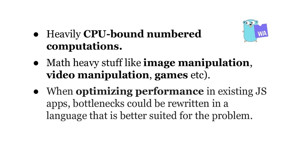 Web Assembly AKA WASM is a new way of running high-level languages into the browsers. Cases where you need to do complex computations like gaming, 3d rendering, AI stuff, etc in any language you want(which has support for WASM), it is something you definitely should try out.