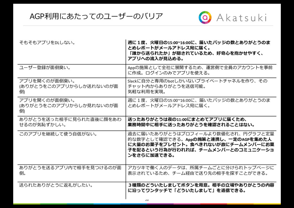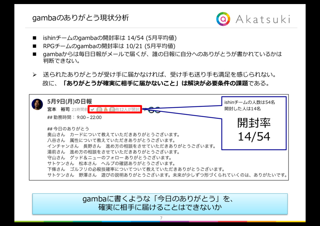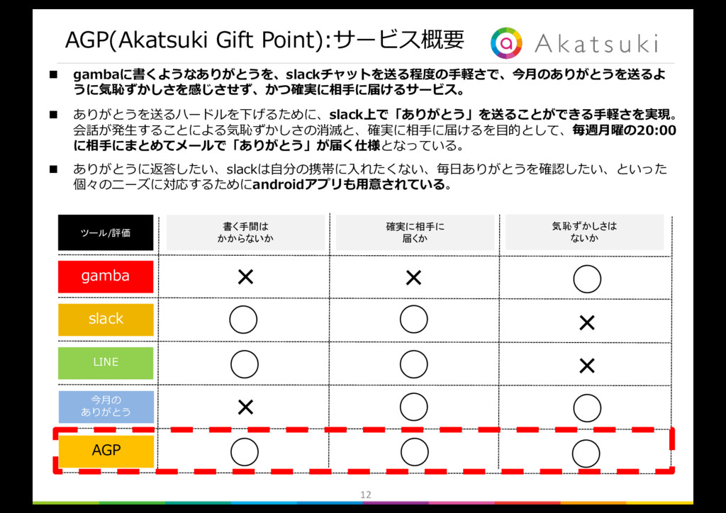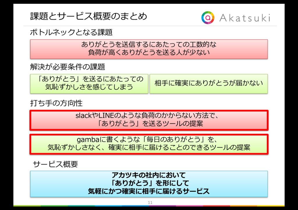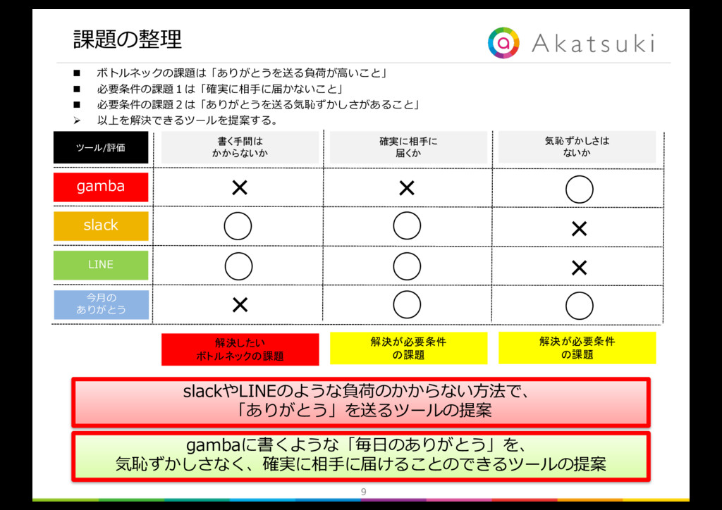 書く手間は かからないか 気恥ずかしさは ないか × × × × ◯ ◯ ◯ ◯ ◯ ◯ ◯ × 解決したい ボトルネックの課題 解決が必要条件 の課題 解決が必要条件 の課題 n ボトルネックの課題は「ありがとうを送る負荷が⾼いこと」 n 必要条件の課題1は「確実に相⼿に届かないこと」 n 必要条件の課題2は「ありがとうを送る気恥ずかしさがあること」 Ø 以上を解決できるツールを提案する。 gambaに書くような「毎⽇のありがとう」を、 気恥ずかしさなく、確実に相⼿に届けることのできるツールの提案 slackやLINEのような負荷のかからない⽅法で、 「ありがとう」を送るツールの提案