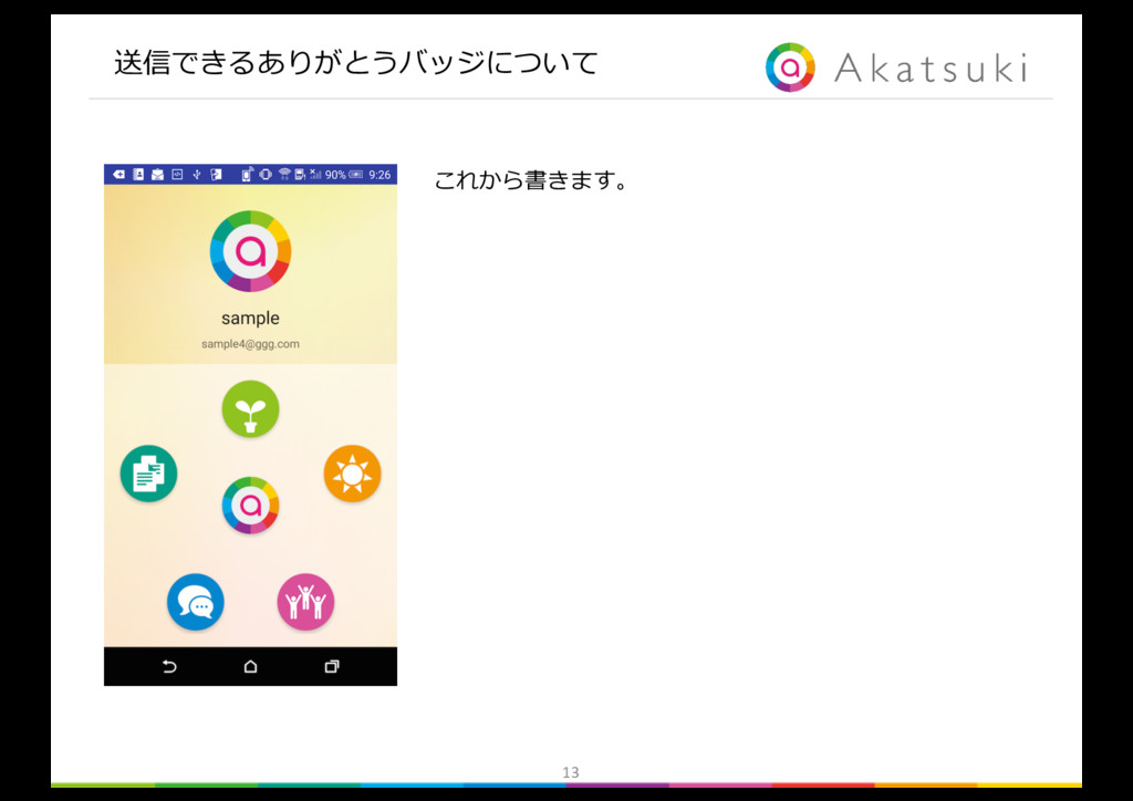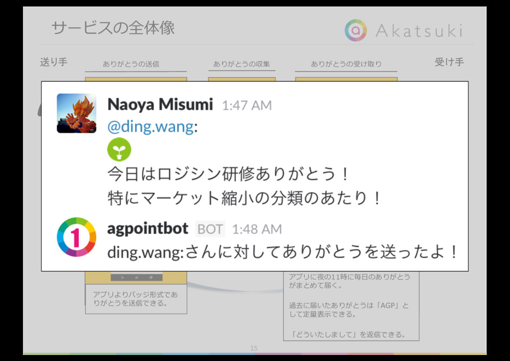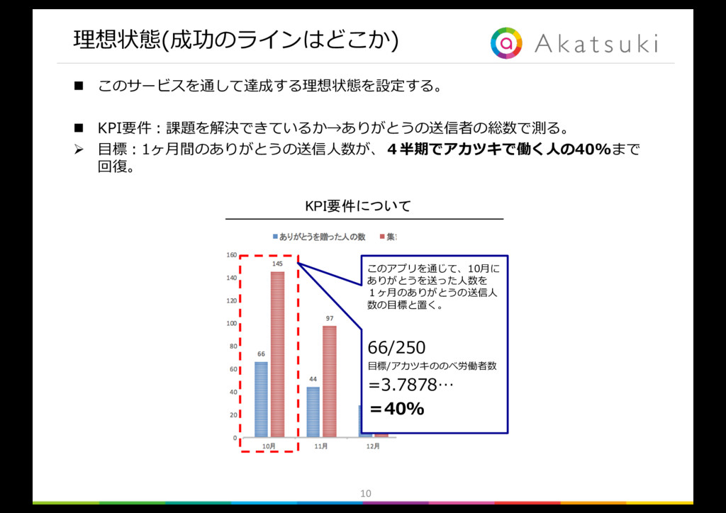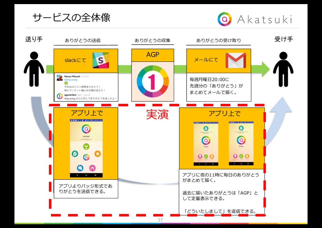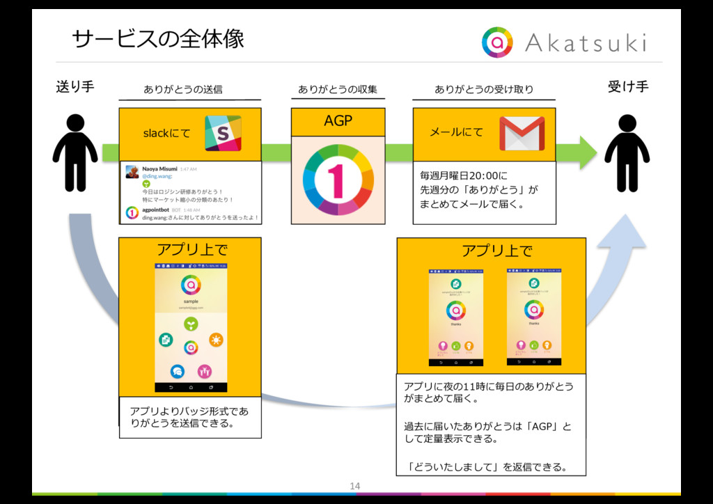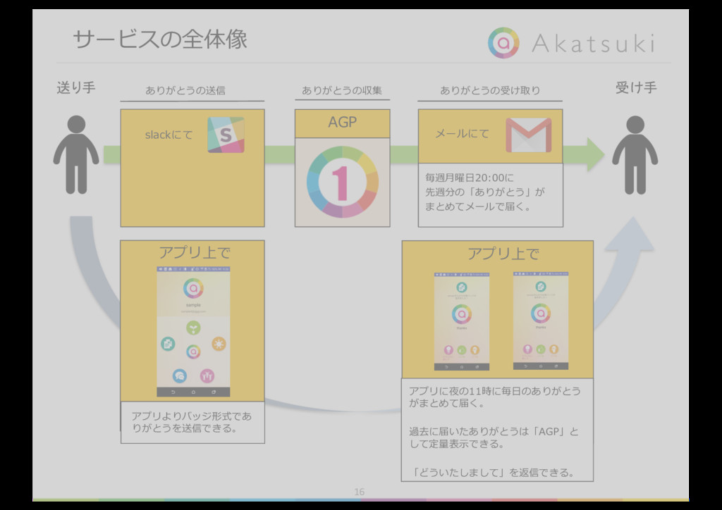 書く手間は かからないか 気恥ずかしさは ないか × × × × ◯ ◯ ◯ ◯ ◯ ◯ ◯ × 解決したい ボトルネックの課題 解決が必要条件 の課題 解決が必要条件 の課題 n ボトルネックの課題は「ありがとうを送る負荷が⾼いこと」 n 必要条件の課題1は「確実に相⼿に届かないこと」 n 必要条件の課題2は「ありがとうを送る気恥ずかしさがあること」 Ø 以上を解決できるツールを提案する。 gambaに書くような「毎⽇のありがとう」を、 気恥ずかしさなく、確実に相⼿に届けることのできるツールの提案 slackやLINEのような負荷のかからない⽅法で、 「ありがとう」を送るツールの提案