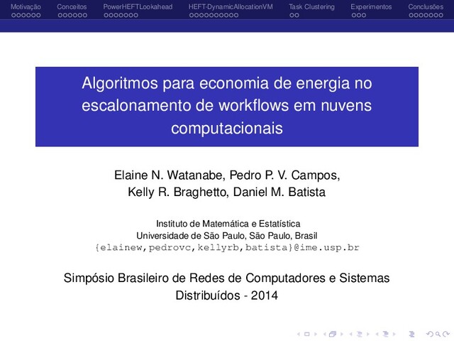 Earliest Finish Time Tarefa VM 1 VM 2 VM 3 rank(ti ) 1 14,9 11,9 9,9 57,9 2 13,8 11,1 9,2 45,6 3 11,7 9,4 7,8 34,3 4 13,8 9,2 12,7 45,6 5 12,7 10,2 8,5 44,7 6 13,8 11,1 9,2 34,2 7 7,4 6 5 24,6 8 5,3 4,3 3,5 22,8 9 19,1 15,3 12,7 34,1 10 22,3 17,9 14,9 18,3 Tarefas em ordem decrescente de rank: 1,2,4,5,3,6,9,7,8,10