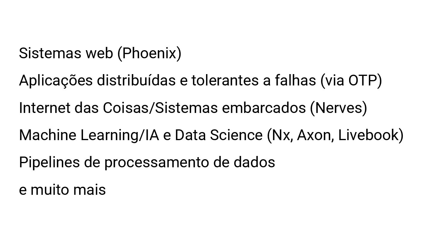 OTP) Internet das Coisas/Sistemas embarcados (Nerves) Machine Learning/IA e Data Science (Nx, Axon, Livebook) Pipelines de processamento de dados e muito mais