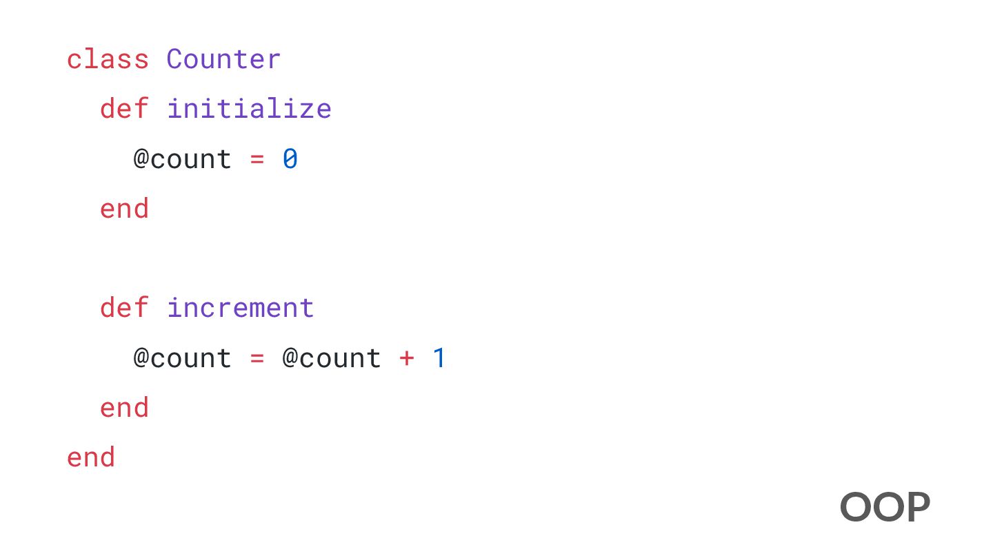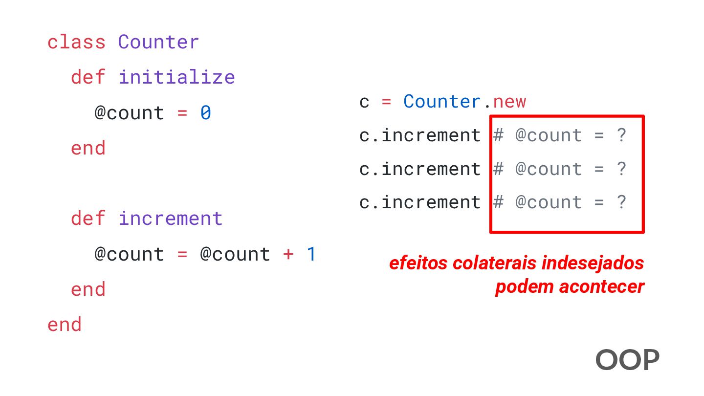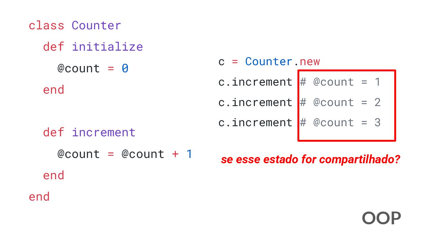 @count = @count + 1 end end OOP c = Counter.new c.increment # @count = 1 c.increment # @count = 2 c.increment # @count = 3 se esse estado for compartilhado?