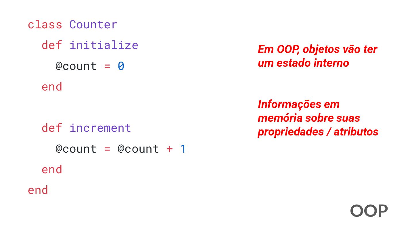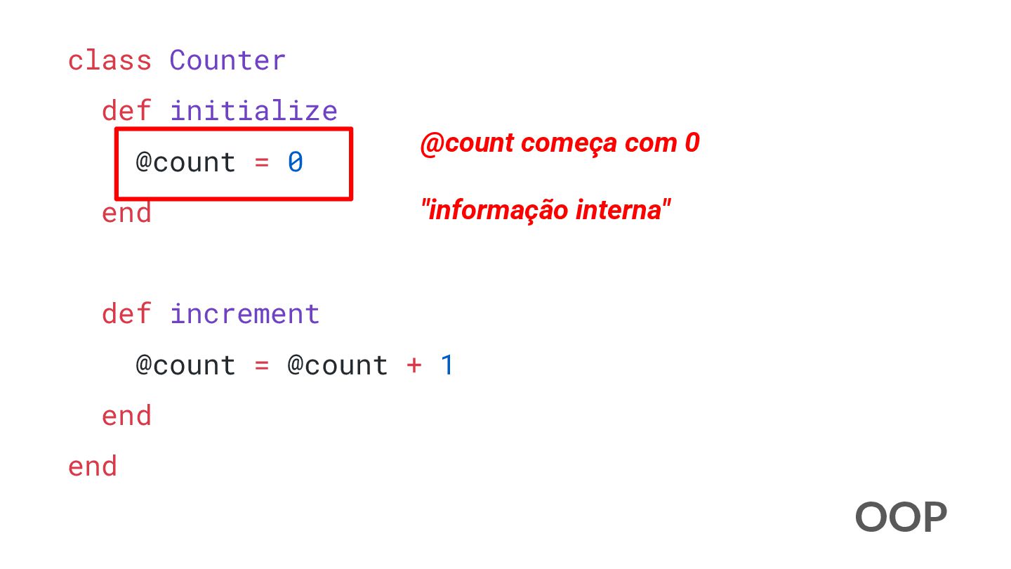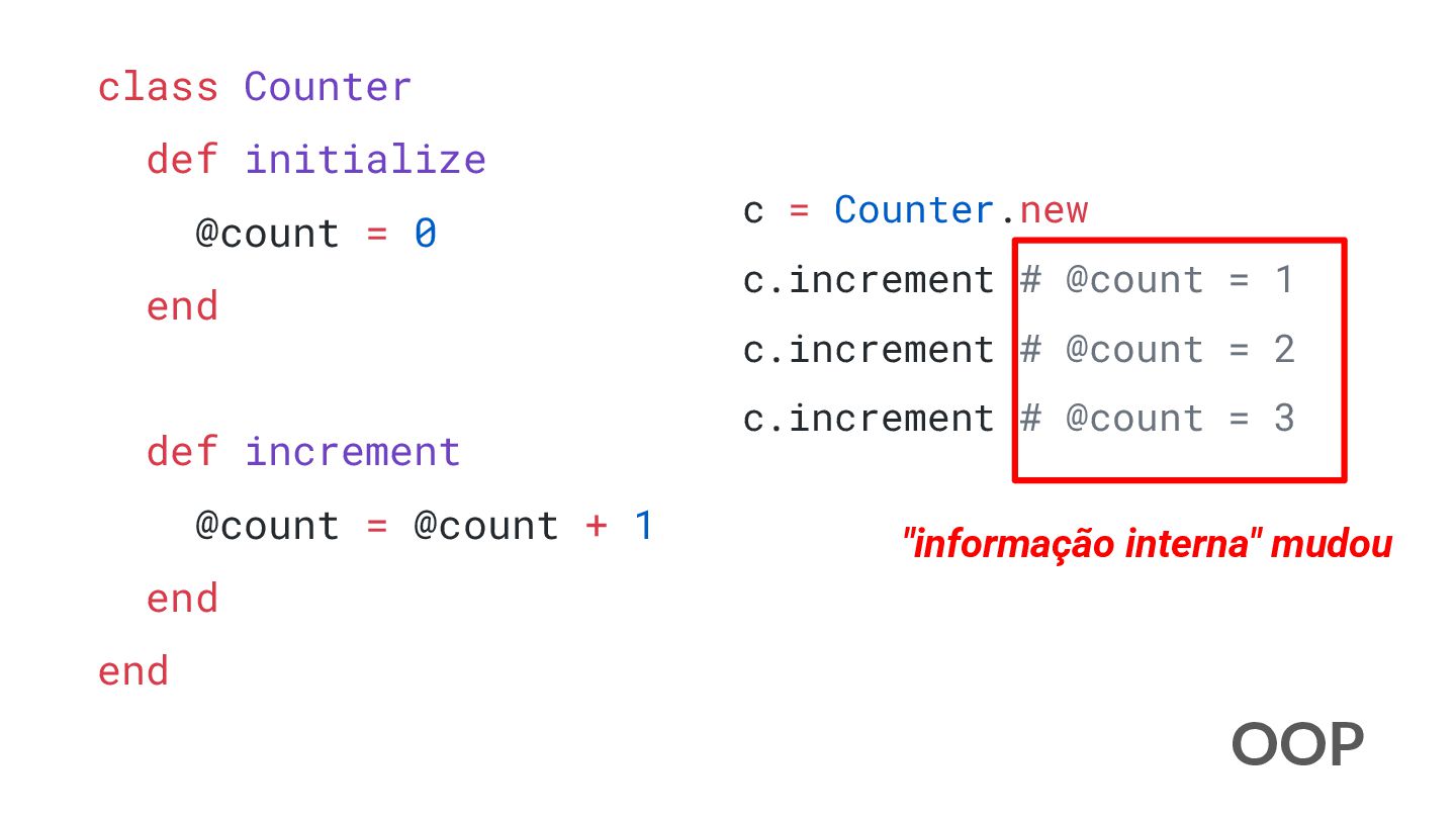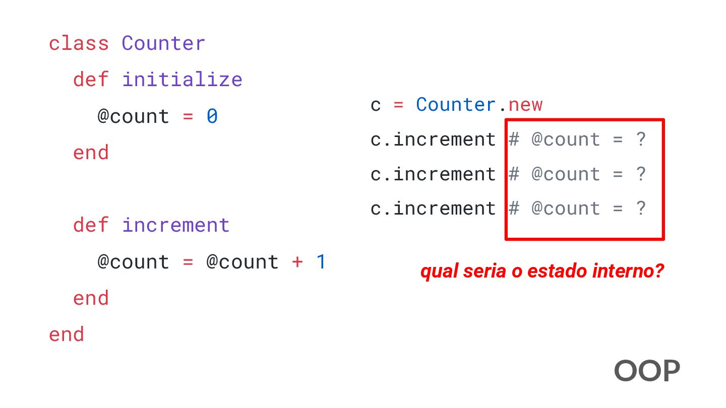 @count = @count + 1 end end OOP c = Counter.new c.increment # @count = ? c.increment # @count = ? c.increment # @count = ? qual seria o estado interno?