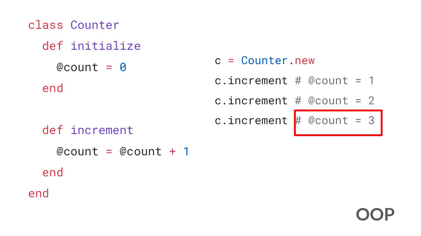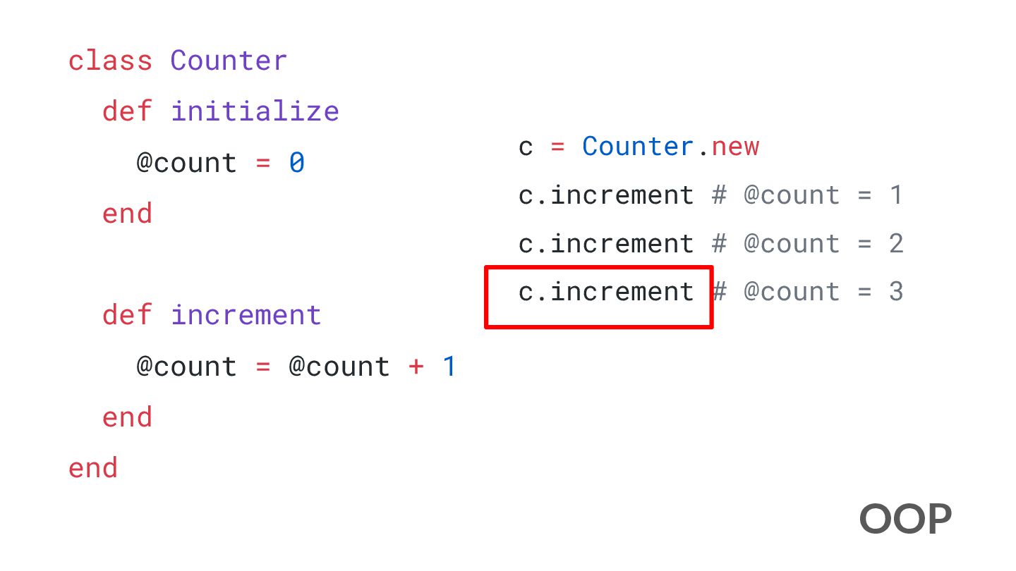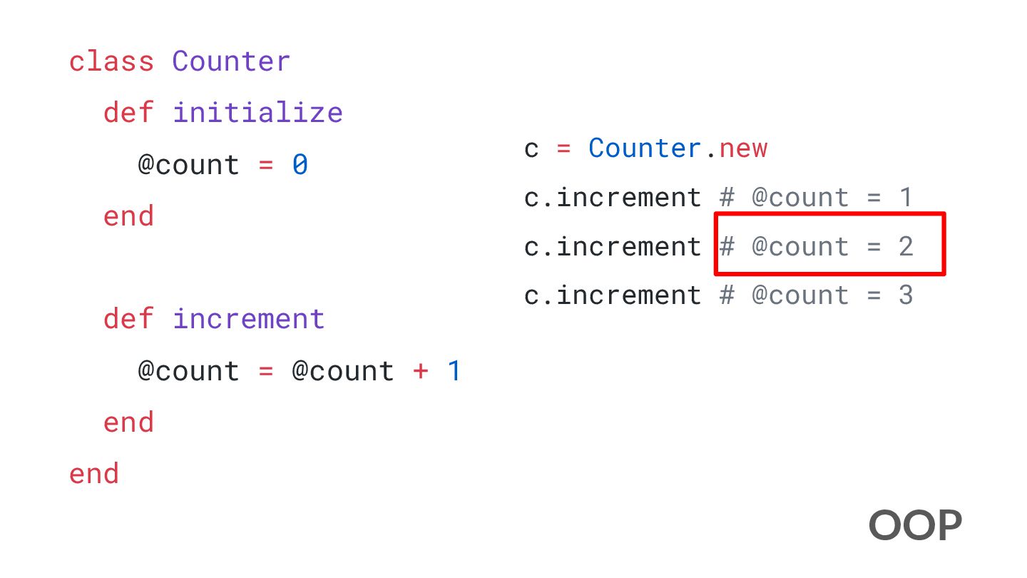 @count = @count + 1 end end OOP c = Counter.new c.increment # @count = ? c.increment # @count = ? c.increment # @count = ? qual seria o estado interno?