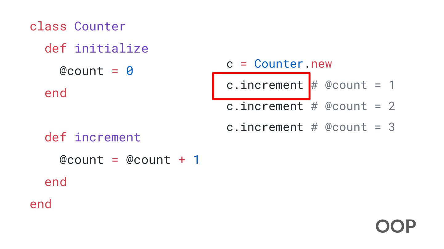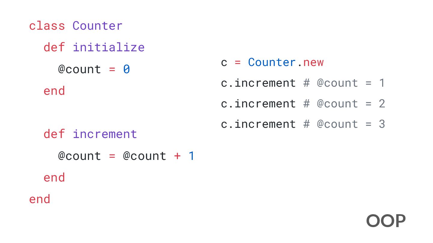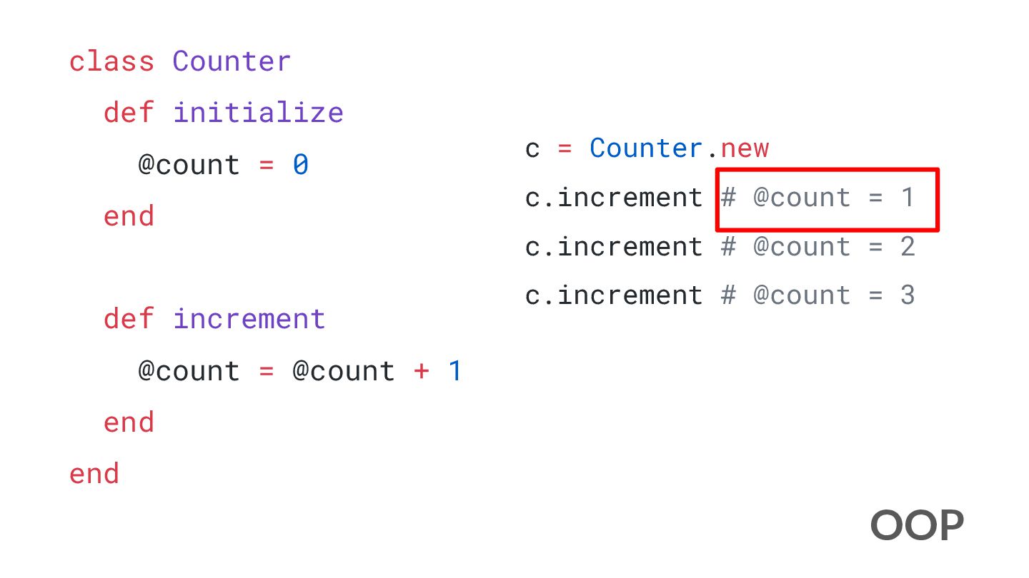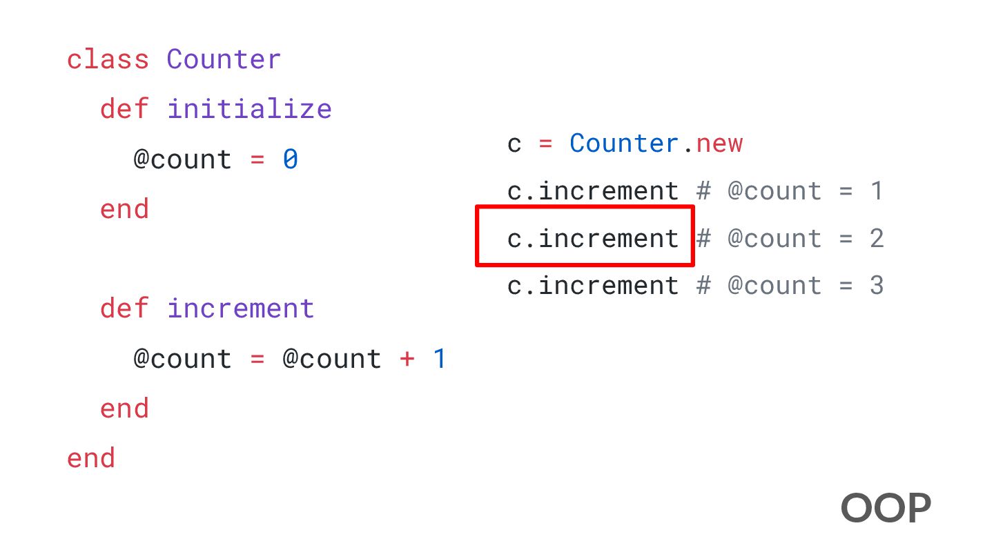 @count = @count + 1 end end OOP c = Counter.new c.increment # @count = ? c.increment # @count = ? c.increment # @count = ? qual seria o estado interno?